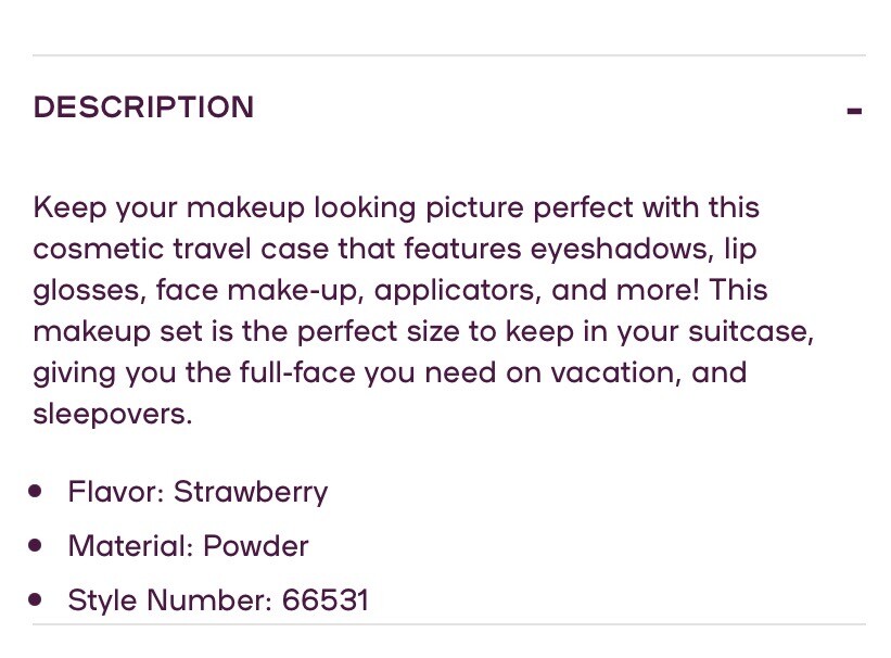 Set Includes: Blush, Eye Shadow, Lip Gloss