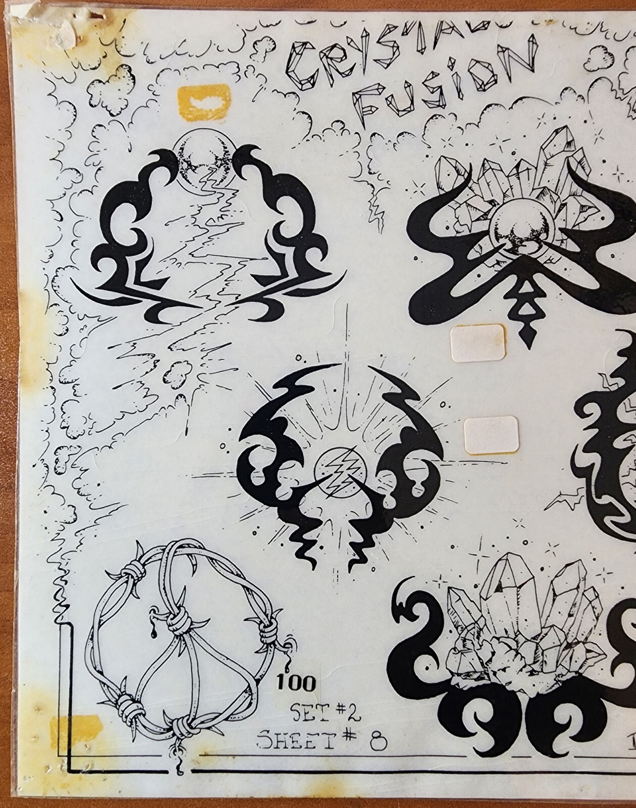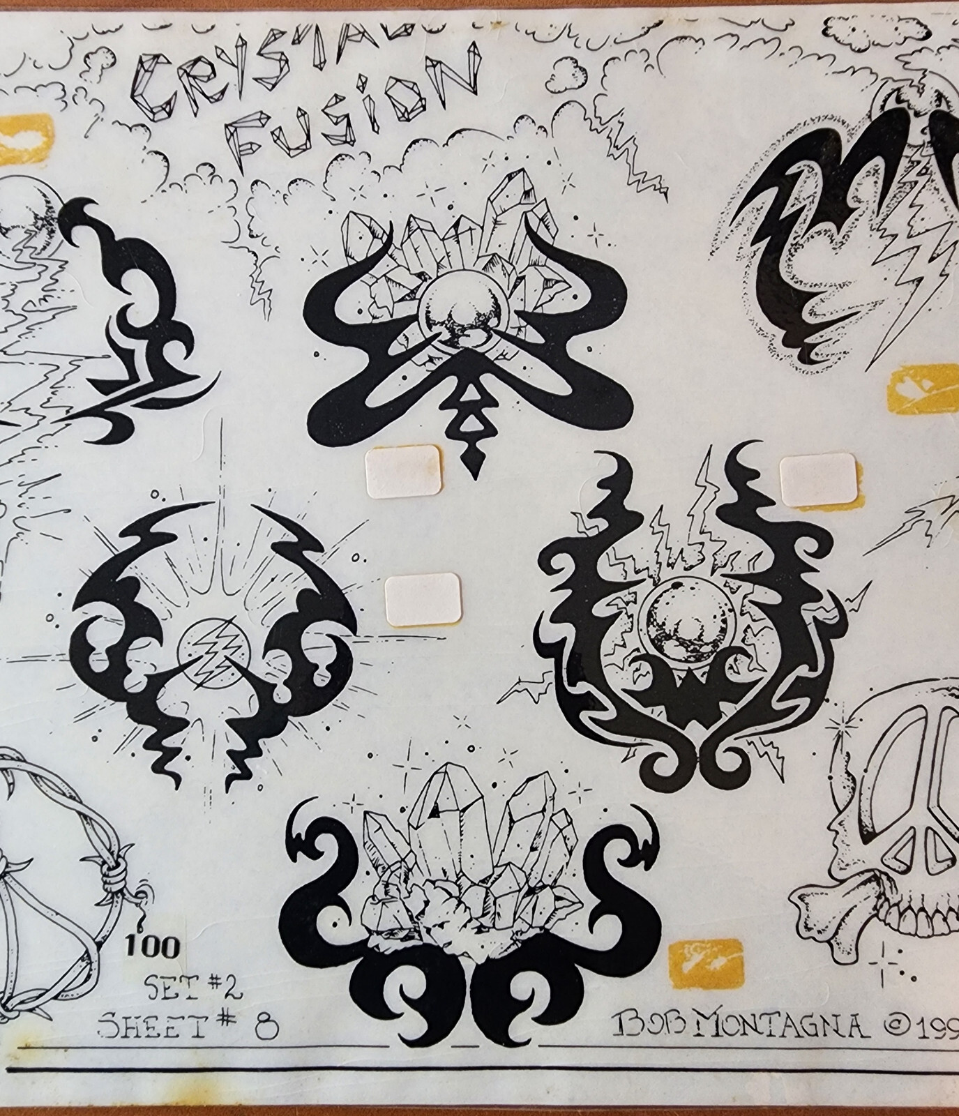 ORIGINAL Vintage Bob Montagna 1990 Shop Used Tattoo Flash Sheet Tribal, Skull
