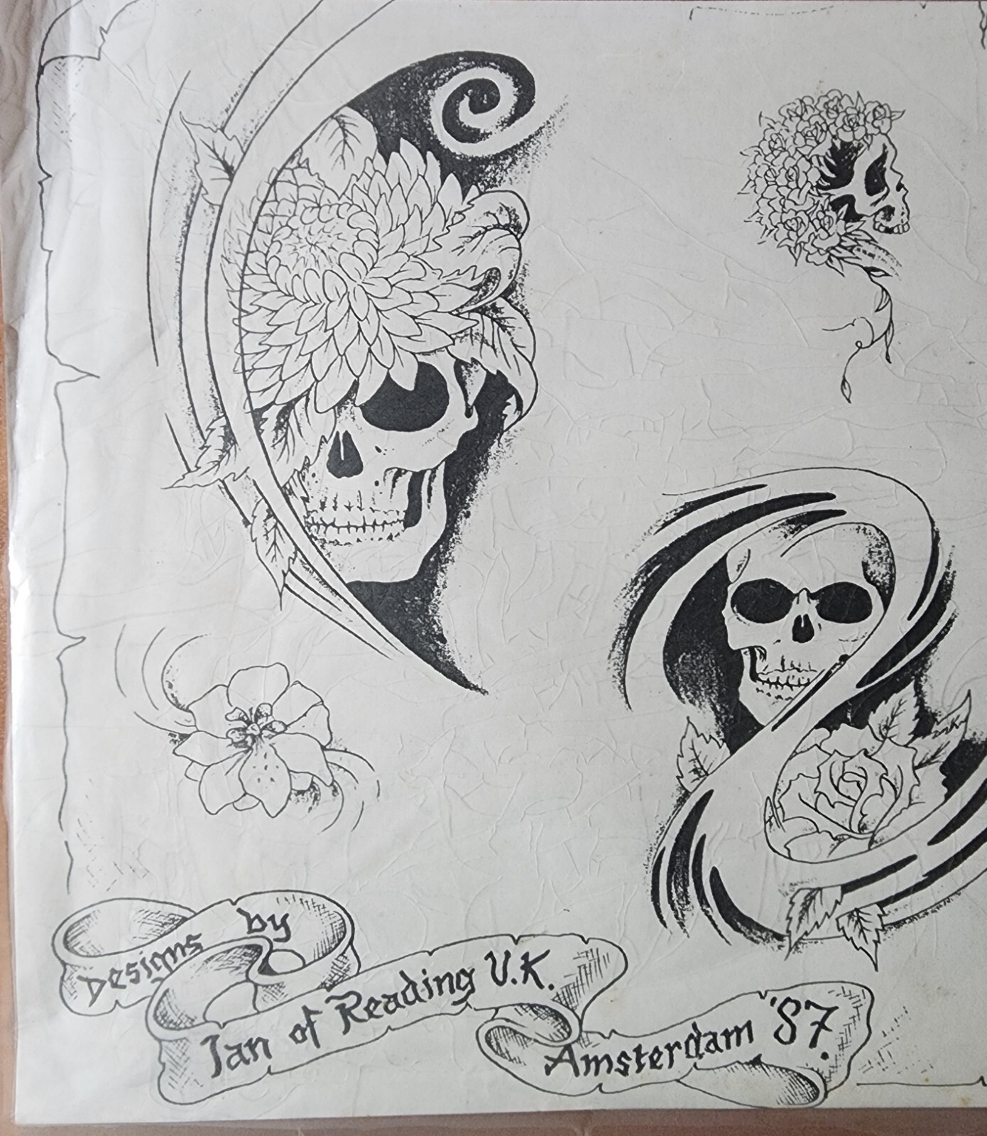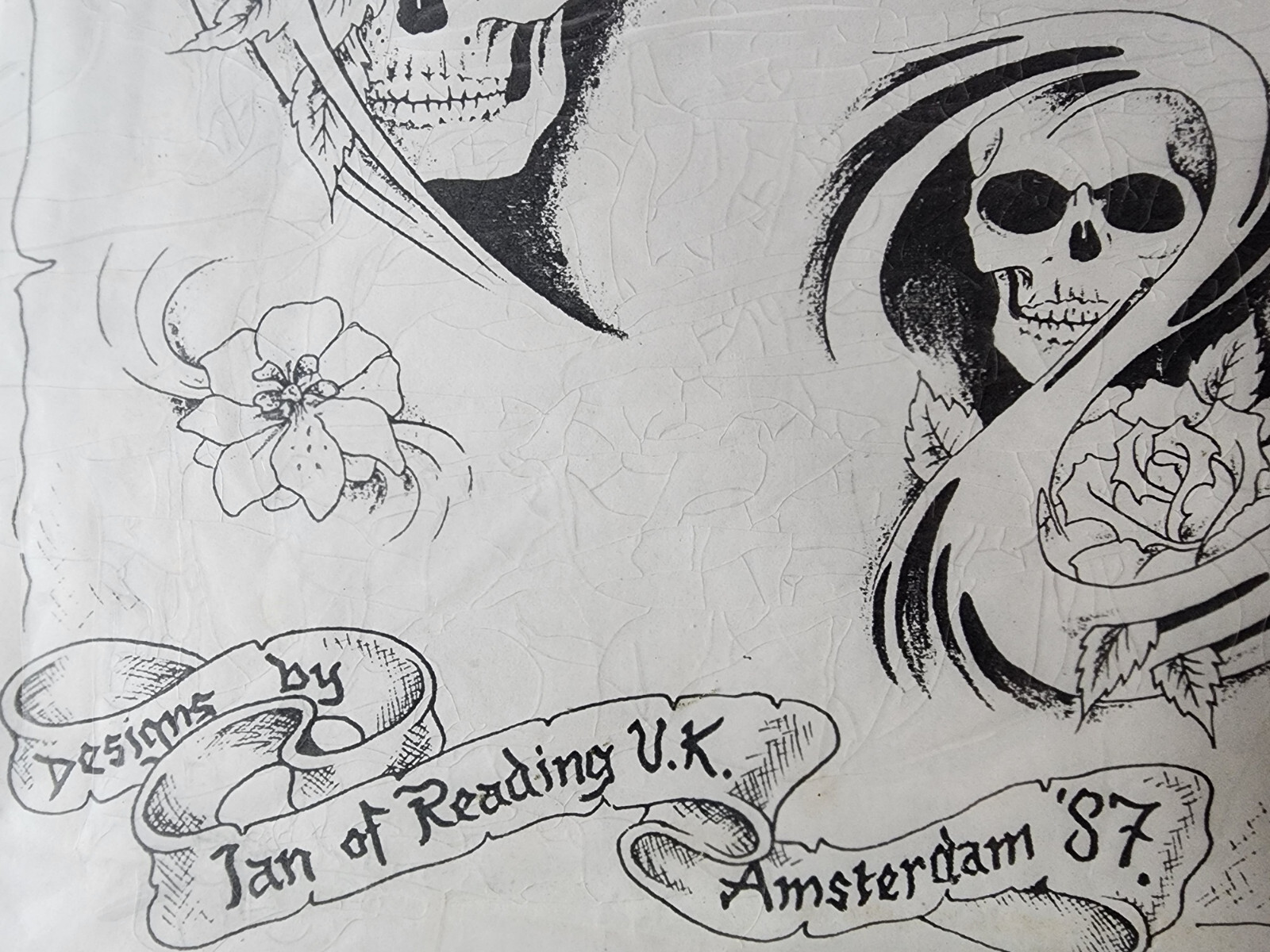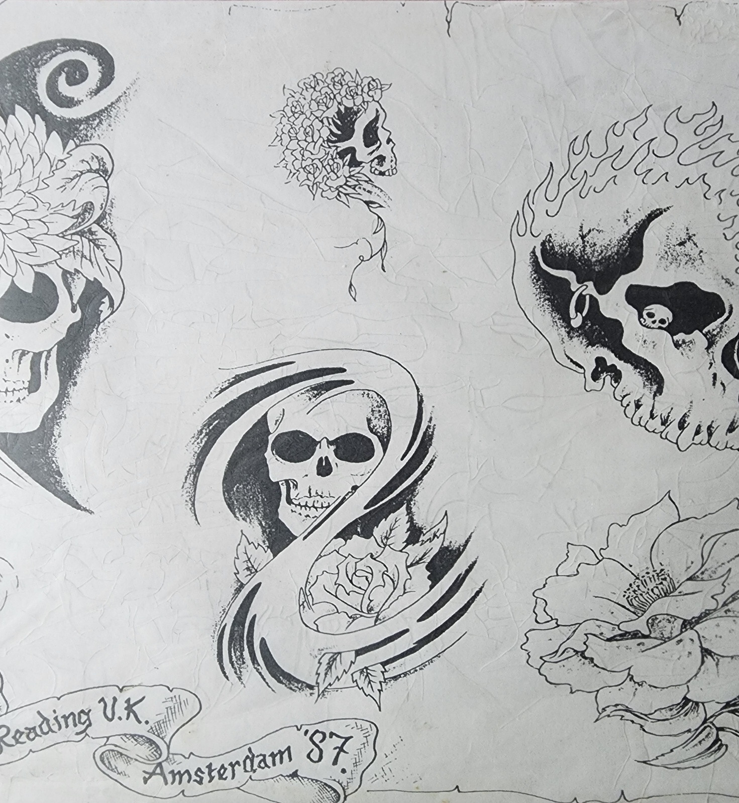 VINTAGE 1987 IAN OF READING Tattoo Flash Sheet Shop Used UK, Amsterdam 87 Skulls
