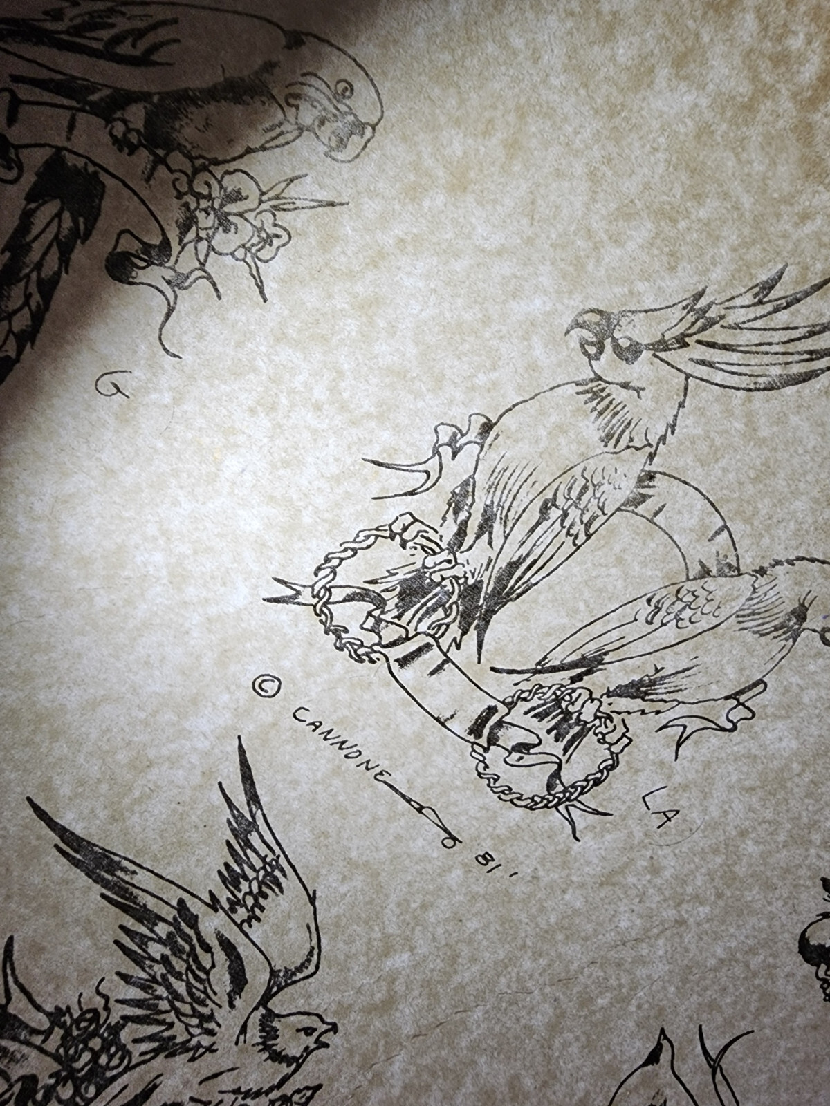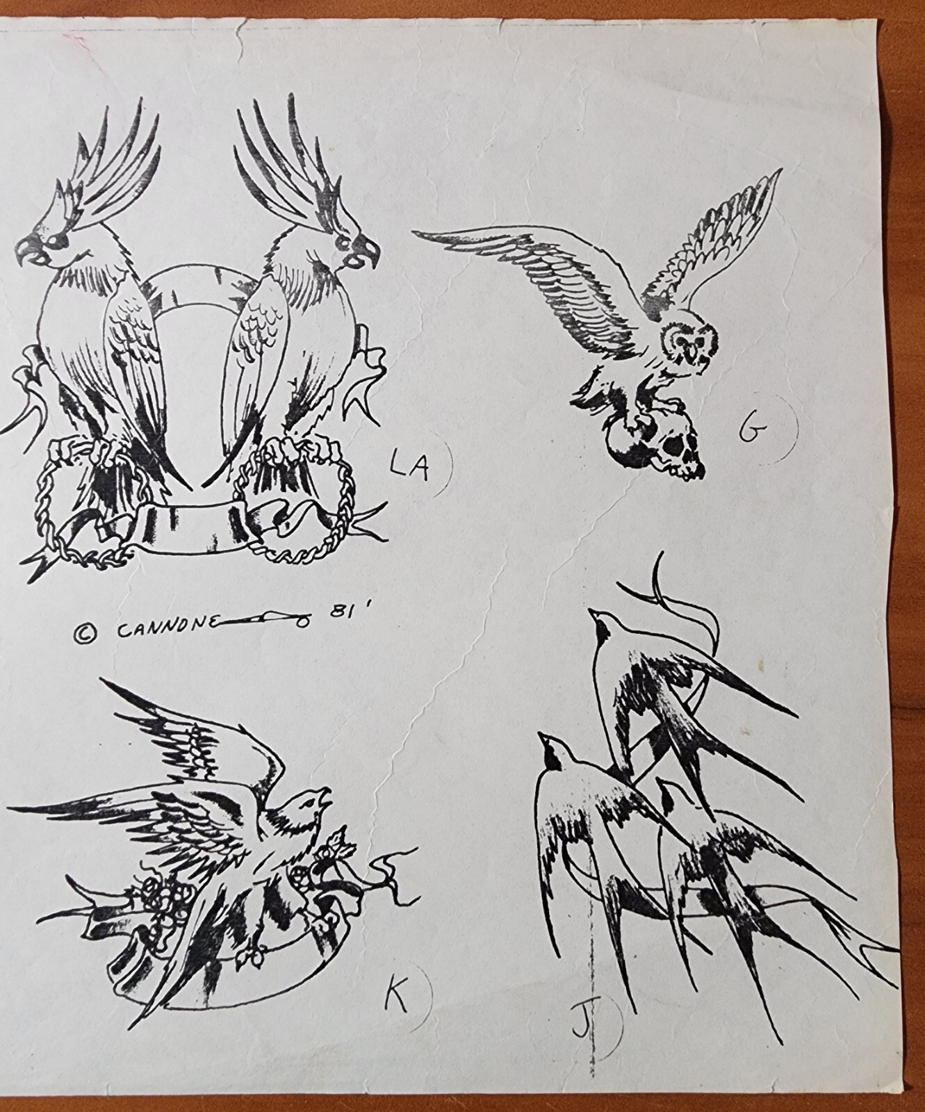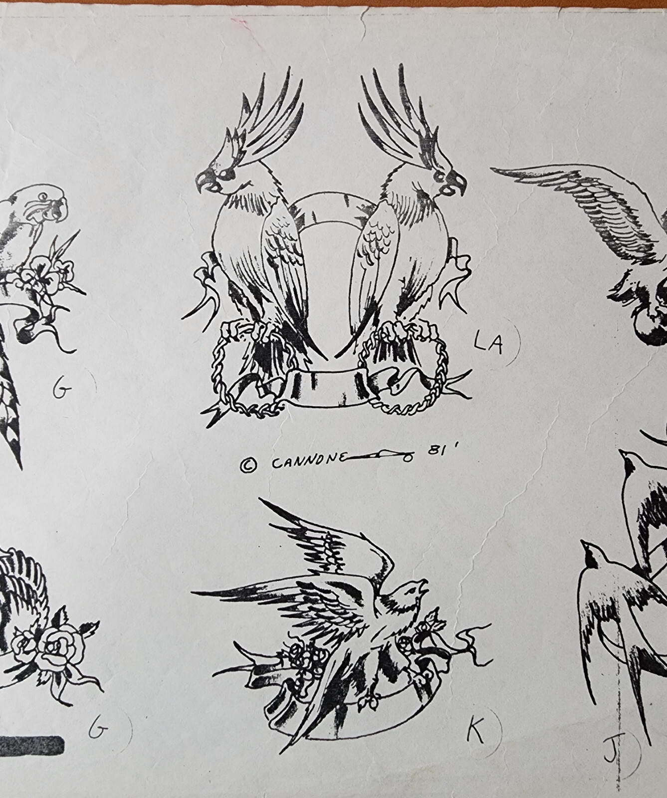VINTAGE Traditional 1981 Guideline Tattoo Flash Sheet Shop Used Cannone, Birds