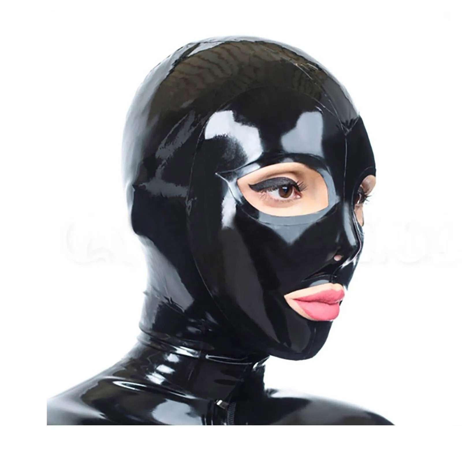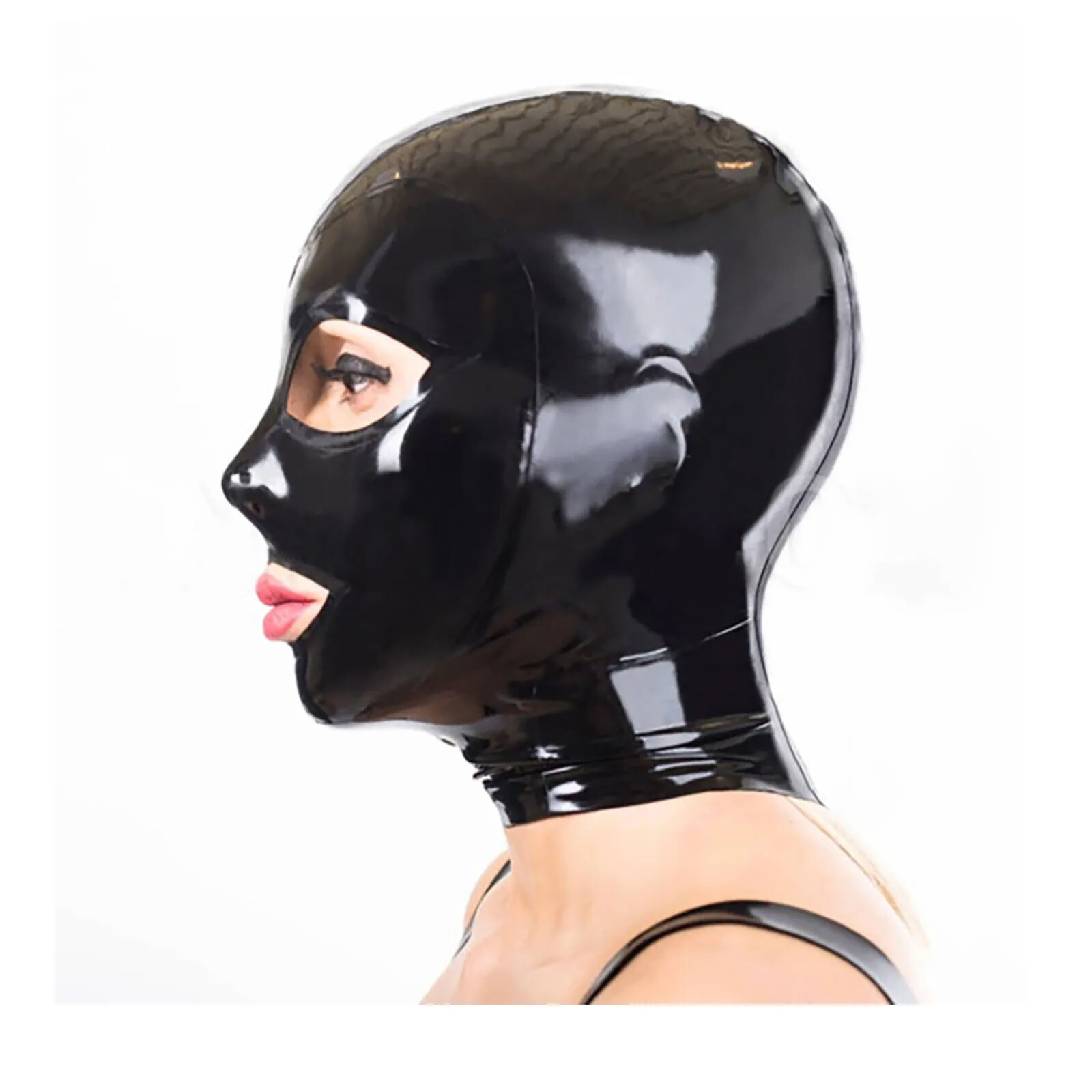 как выглядит Pure Black Latex Hood Exposed Eyes Nose Rubber Mask BDSM Fetish Party Cosplay фото