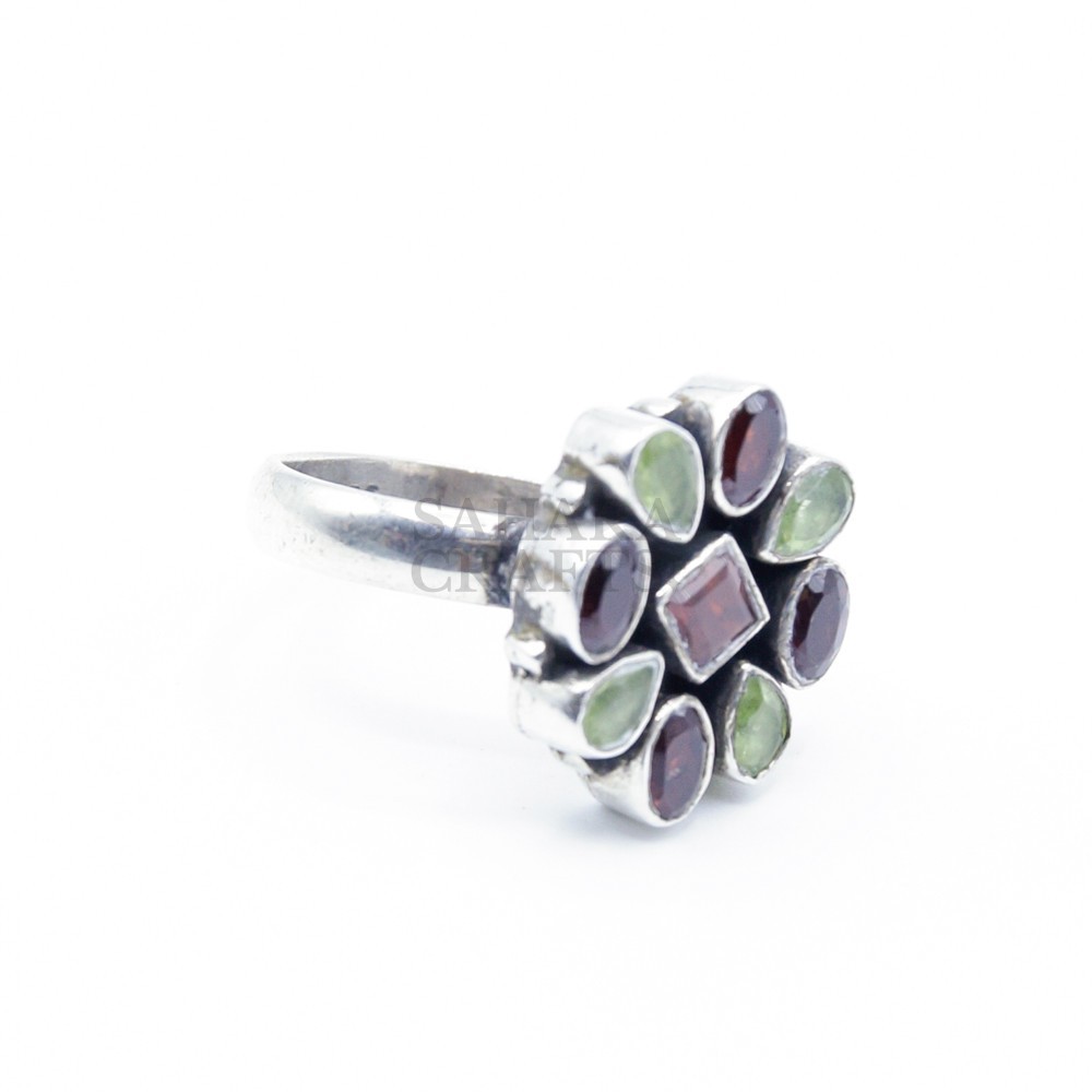 Multi Stone Ring in Silver 925 boho and Symmetrical Garnet Quartz and Peridot