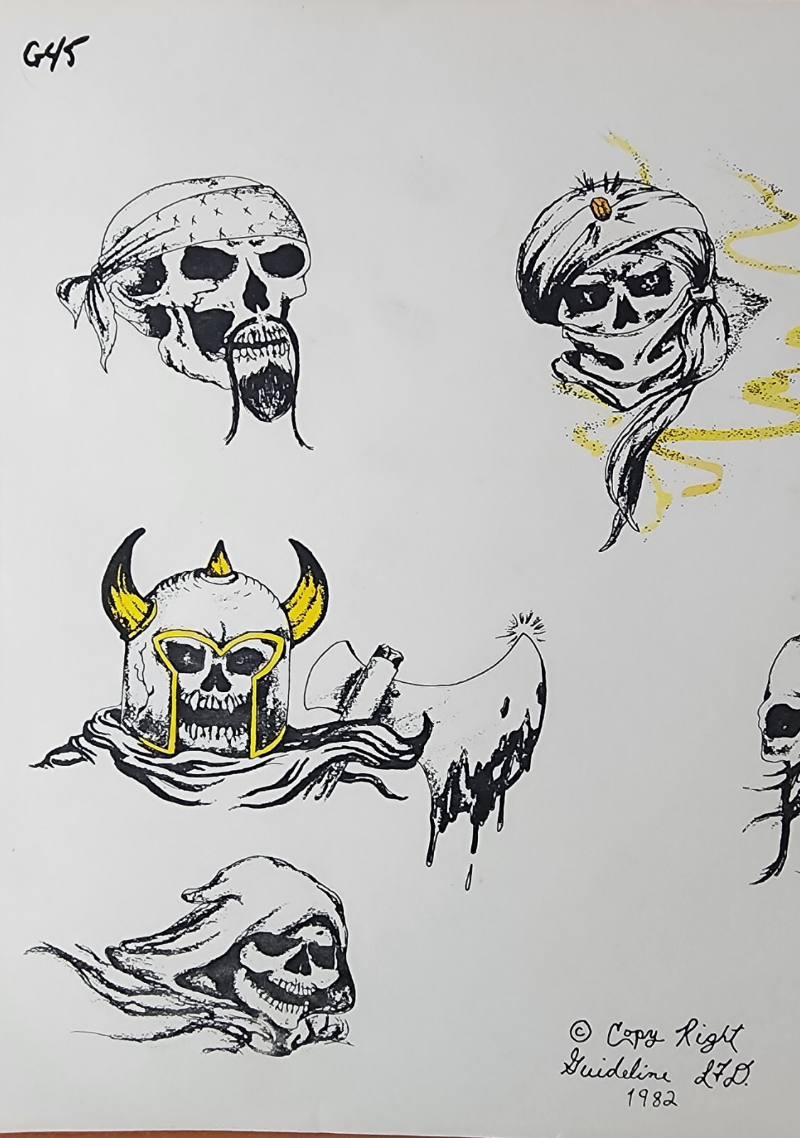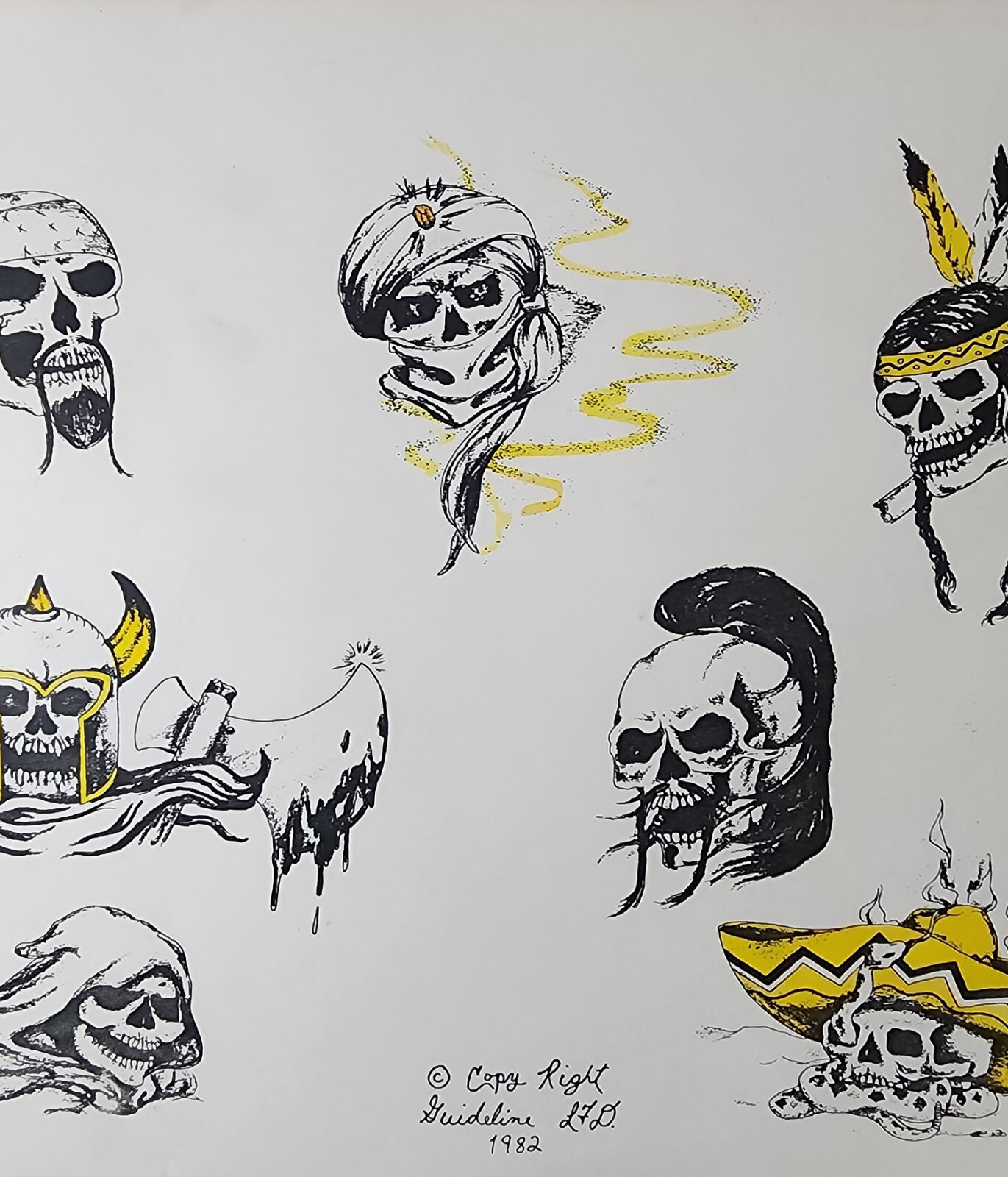 ORIGINAL Vintage 1982 Guideline LTD Shop Used Tattoo Flash Sheet Biker, Skulls