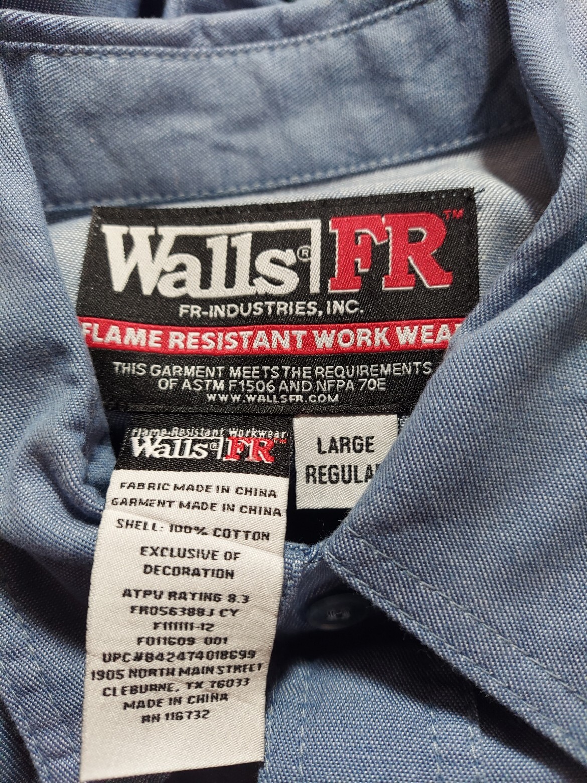 Walls Flame Resistant Work Wear Long Sleeve 100 Cotton Blue Men's Regular Lg
