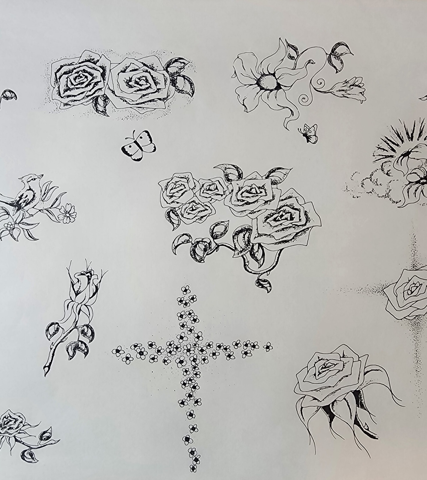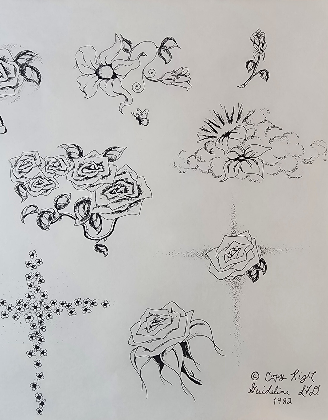 ORIGINAL Vintage 1982 Guideline LTD Shop Used Tattoo Flash Sheet Flowers, Rose