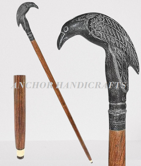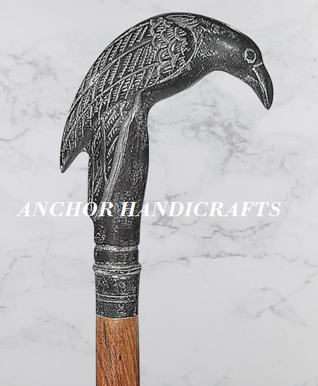 Vintage Collectable Handmade Black Raven Brown wooden walking stick Cane