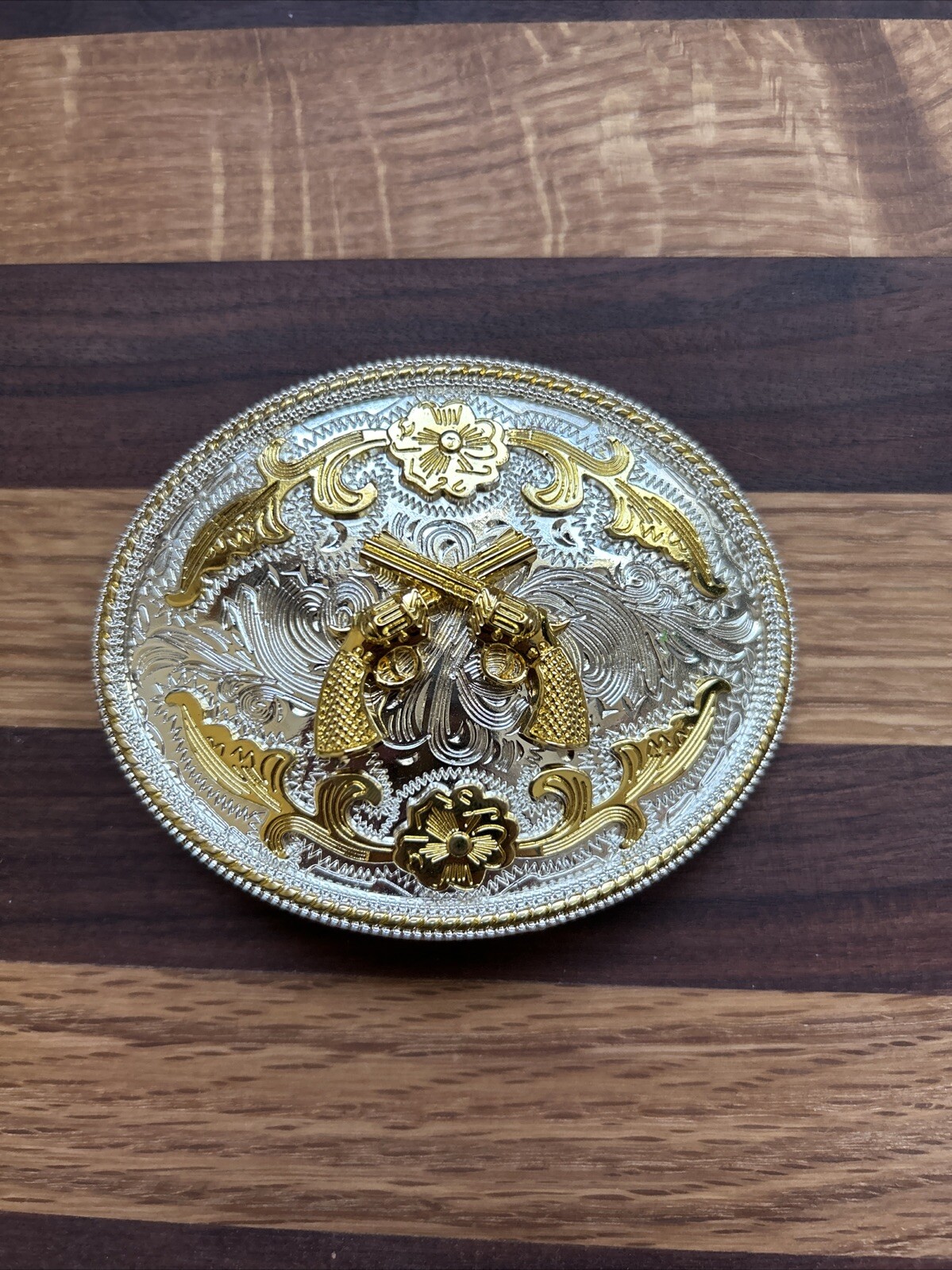 как выглядит Golden Crossed Guns Design Silver Metal Belt Buckle фото