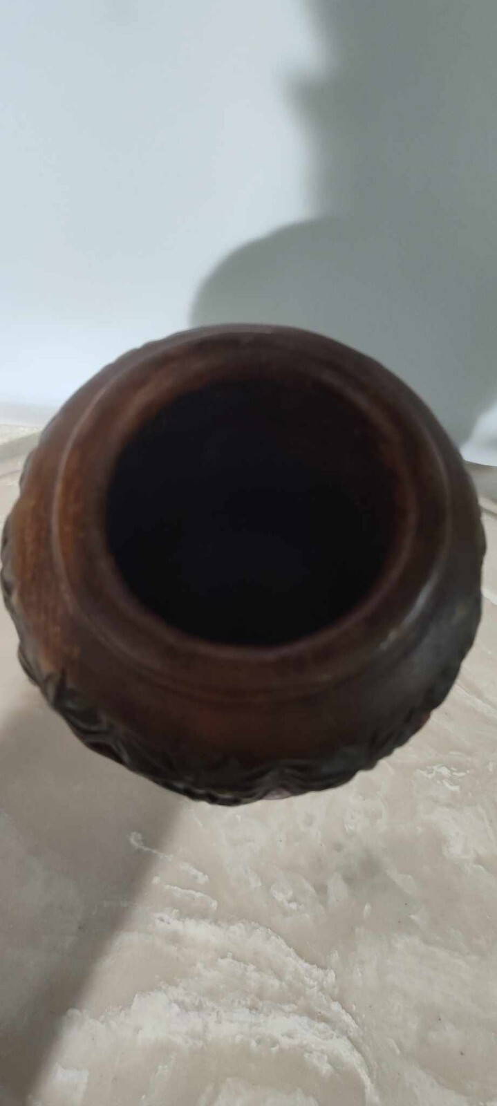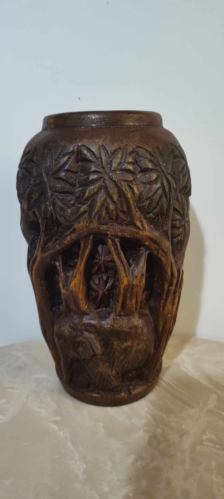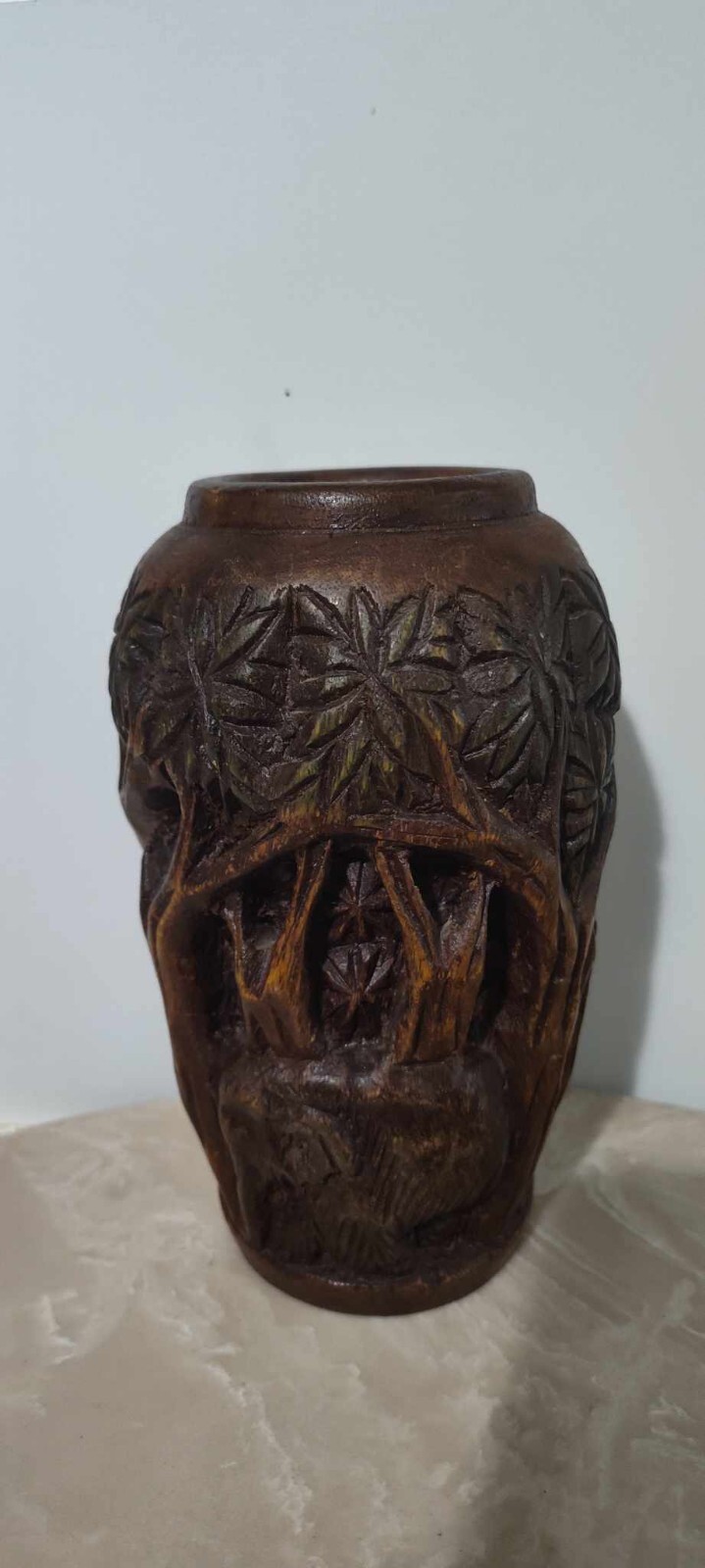 как выглядит Vintange Wood Carved Jungle Elephant Vase фото