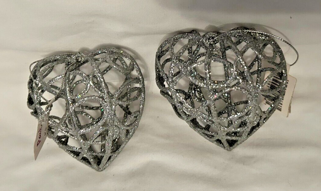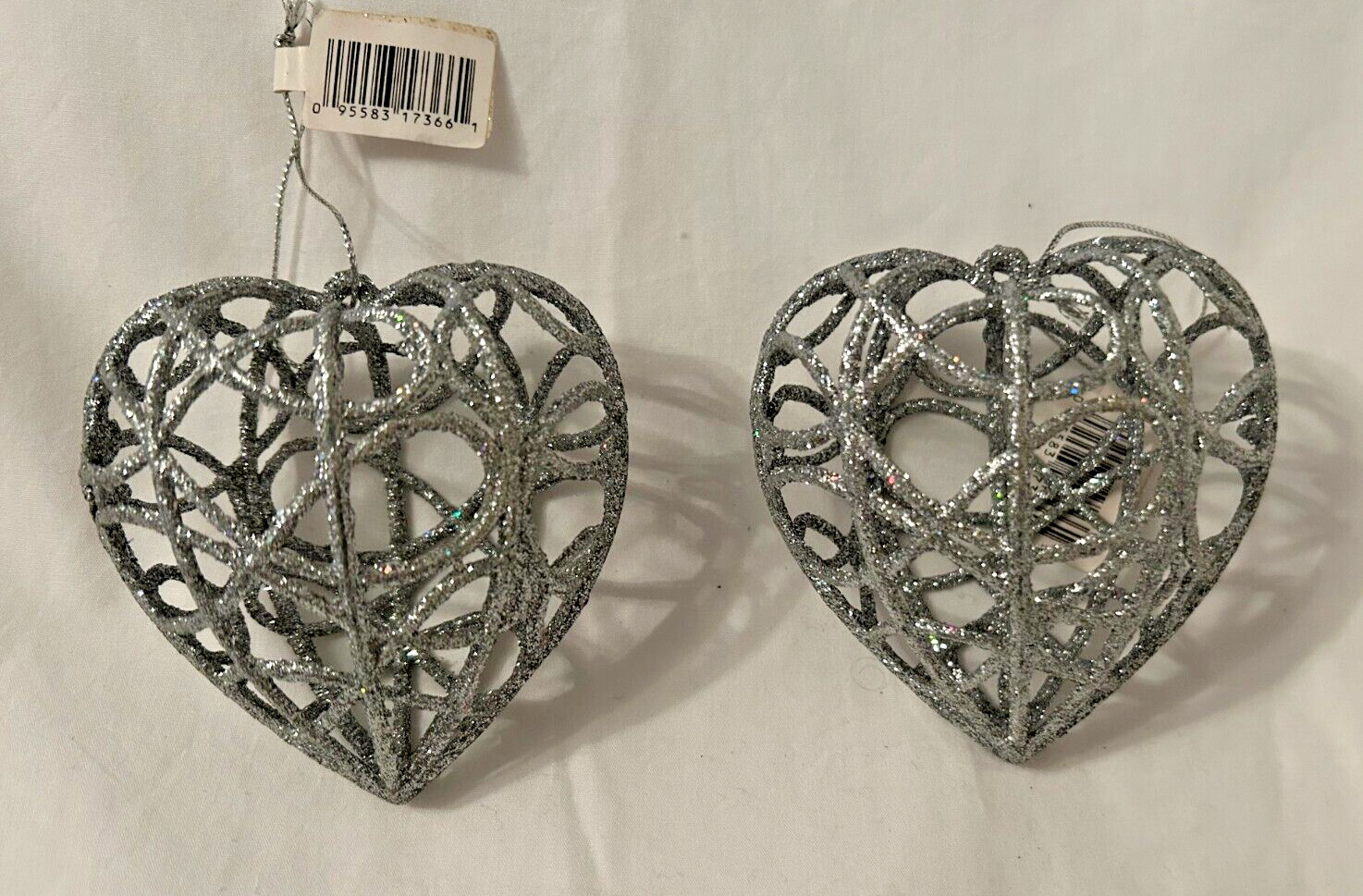 Set Of Three Heart Shaped Christmas Ornaments Glittery Silver