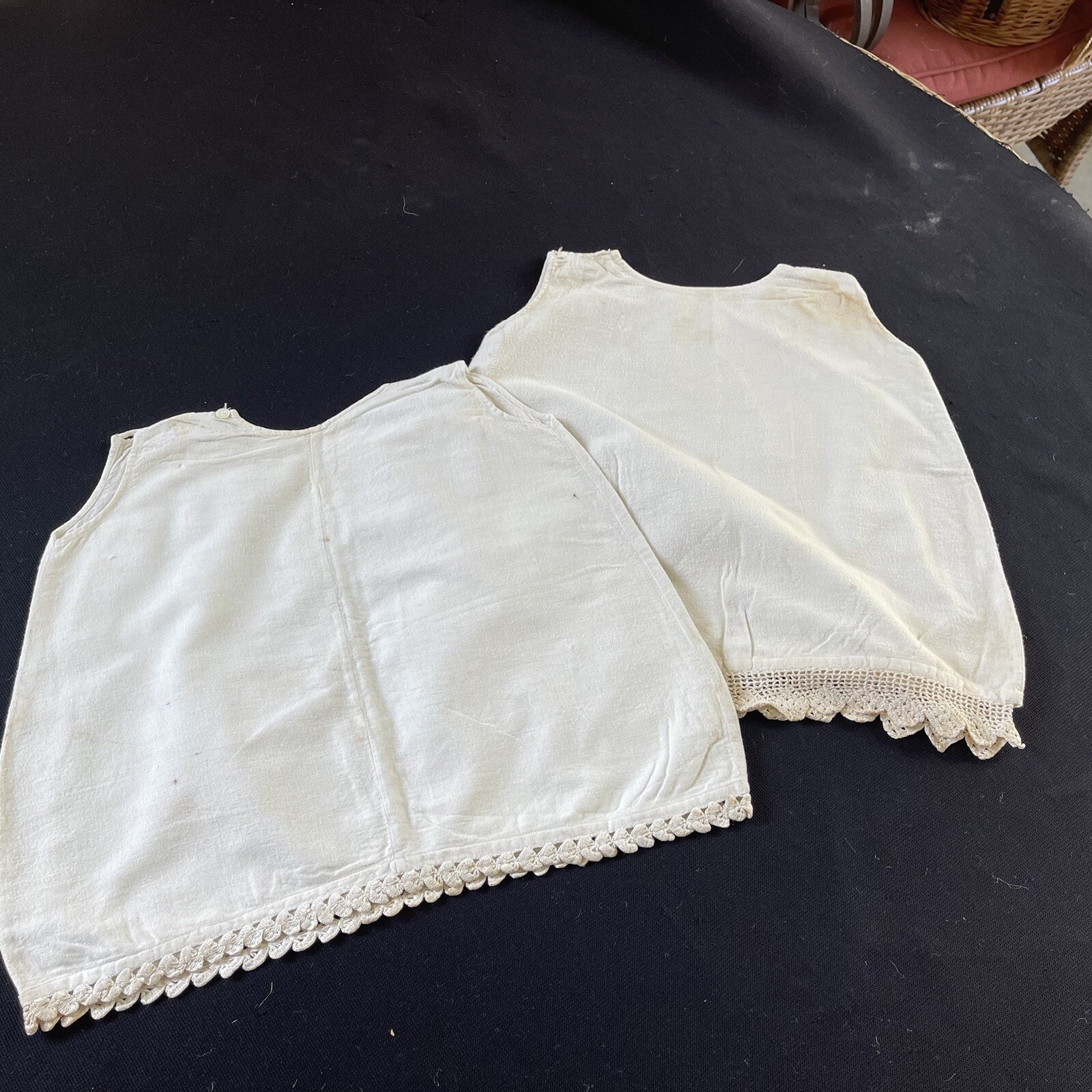 Pair of Antique Off White Flannel Child s Gowns With Hand Crochet Lace