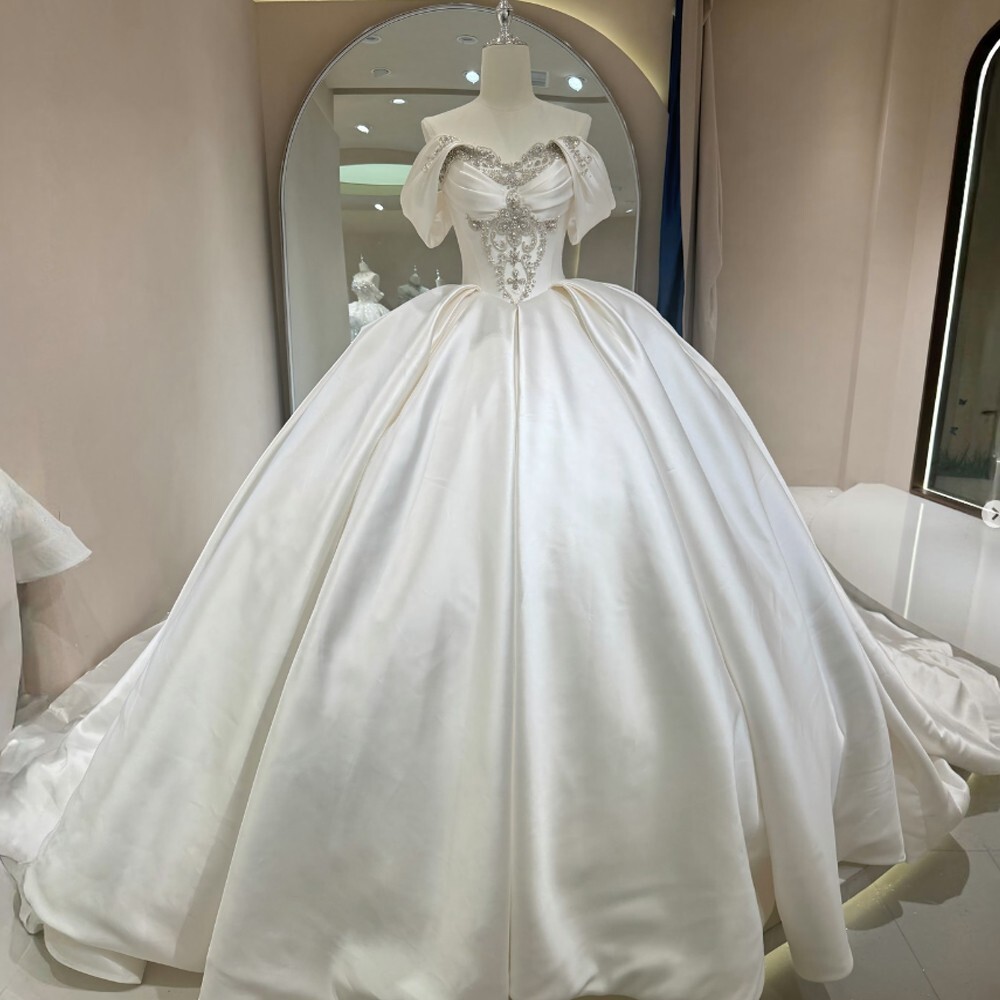 Off Shoulder Satin Wedding Dresses Beaded White Ivory Sweep Train Bridal Gowns
