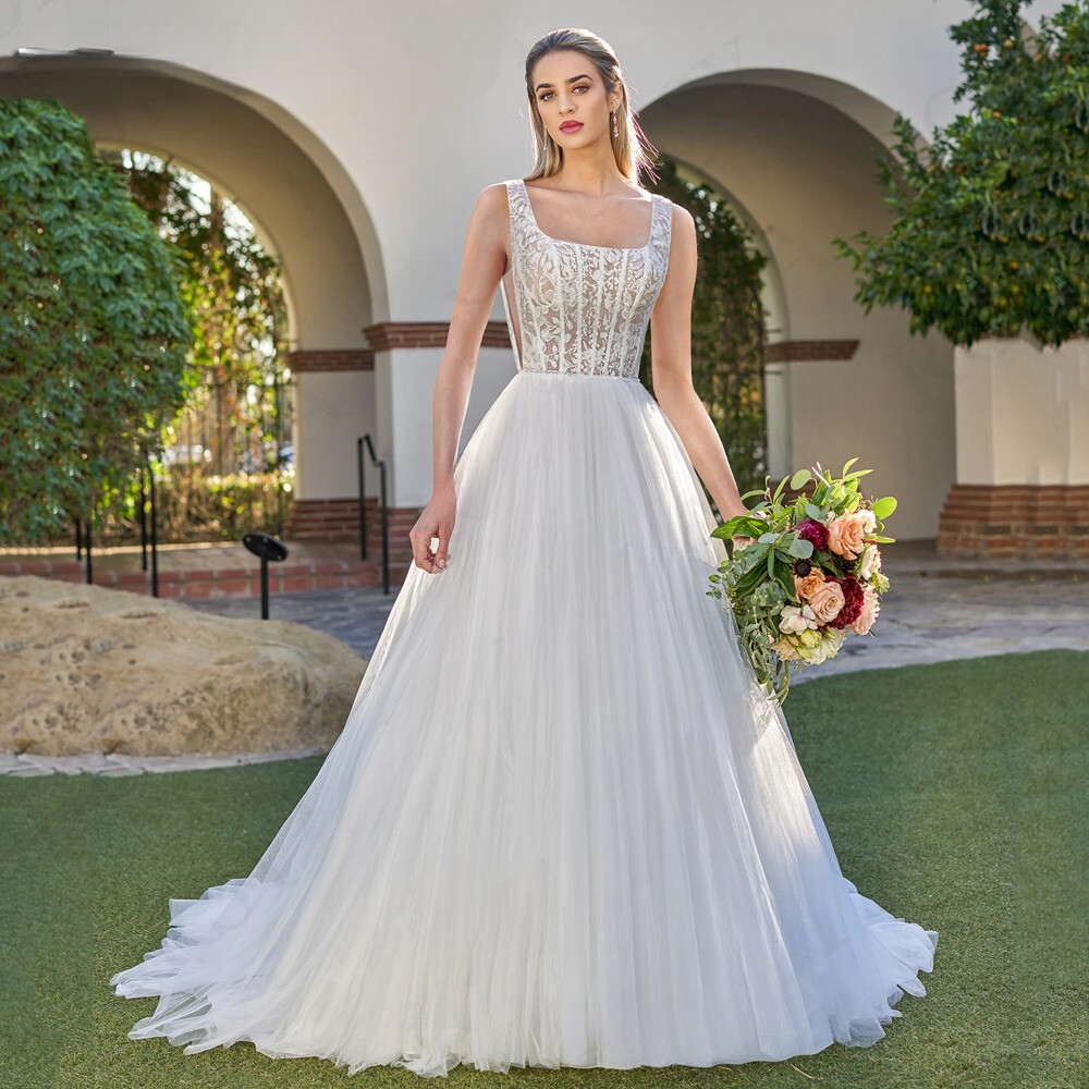 Luxury A-Line Wedding Dresses Square Neck Sleeveless Lace Appliques Bridal Gowns