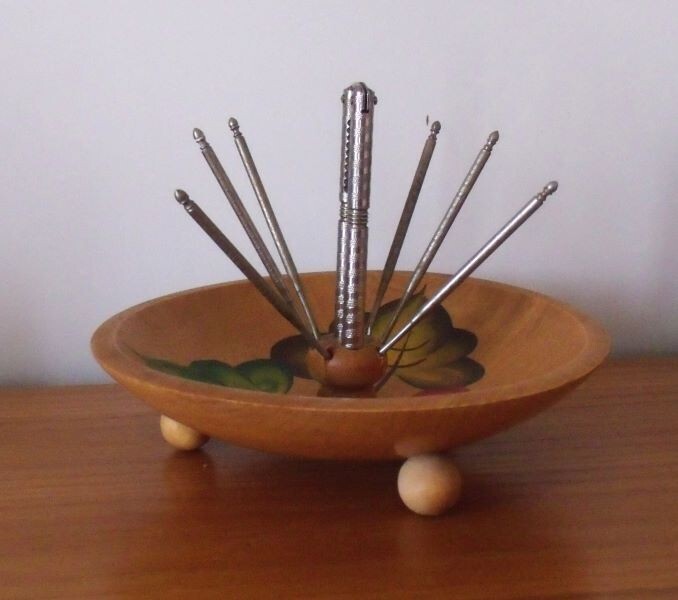 Vintage Wooden Nut Bowl with Leaf Design and Nutcracker and 6 Picks