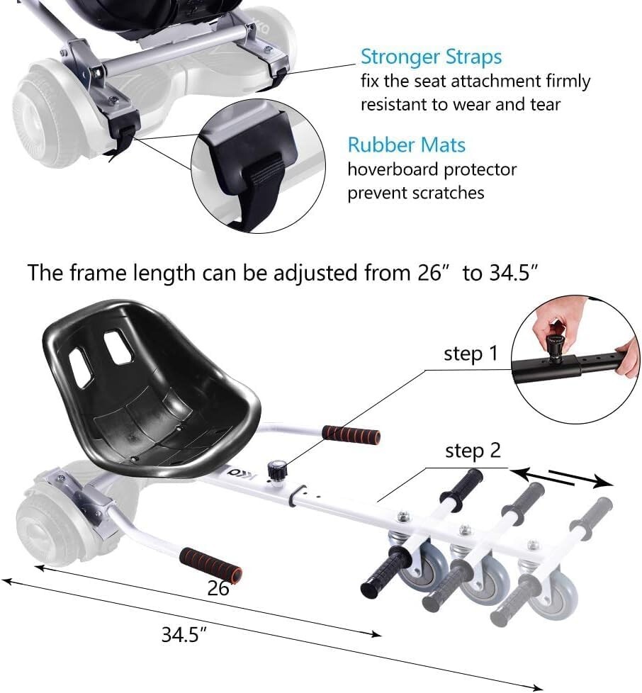 Особенности: 360° Drifting Wheel, Adjustable Frame, Soft Handle Bar, Upgraded Seat, Sturdy and Durable Straps, Adjustable Brackets, Rubber Mats, All ages & all heights- adjustable length from 26” to 34.5”, Maximum load 242lb, Easy to steer & easy to assemble, Stronger durable straps & full locknuts, Reinforced seat & heavy duty frame, 360° swivel wheel & rubber mats & soft handles, Fit most 6.5”, 8” and 10” hoverboards