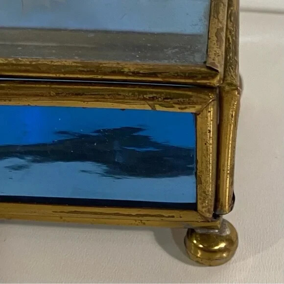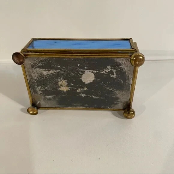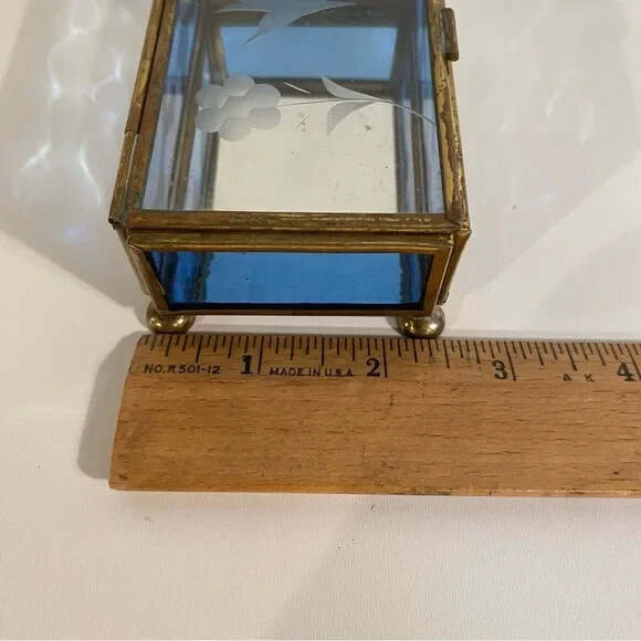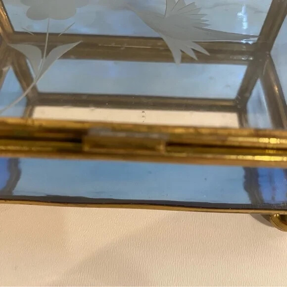 • Vintage Floral Etched Glass Brass Trinket Box Mirrored Bottom Ball Feet