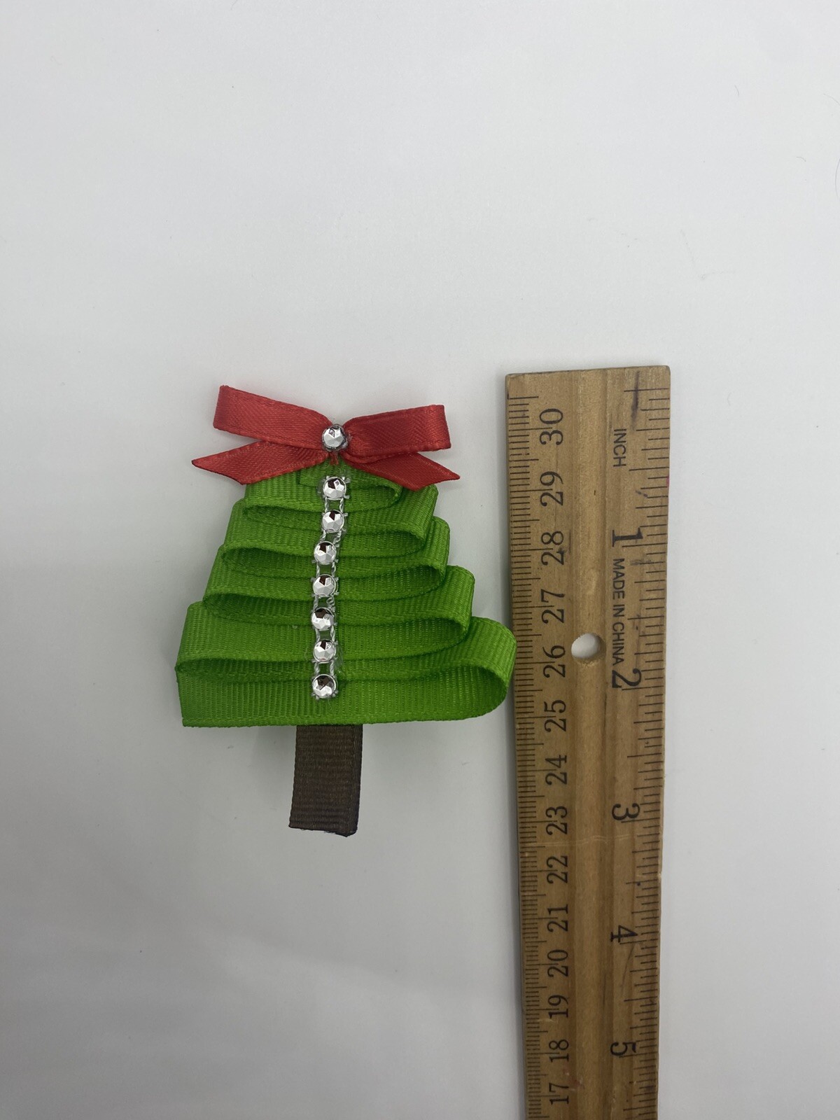 Christmas Tree W/Red Bow Hair Clip For Girls /Light Green With Bling