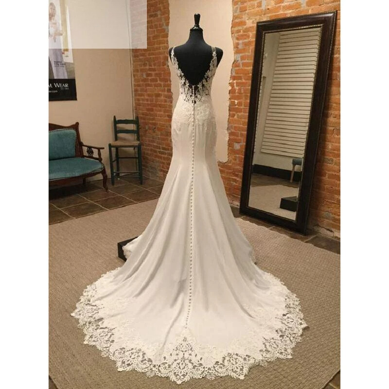 Satin Wedding Dress V Neck Spaghetti Straps Floor Length Mermaid Sweep Train