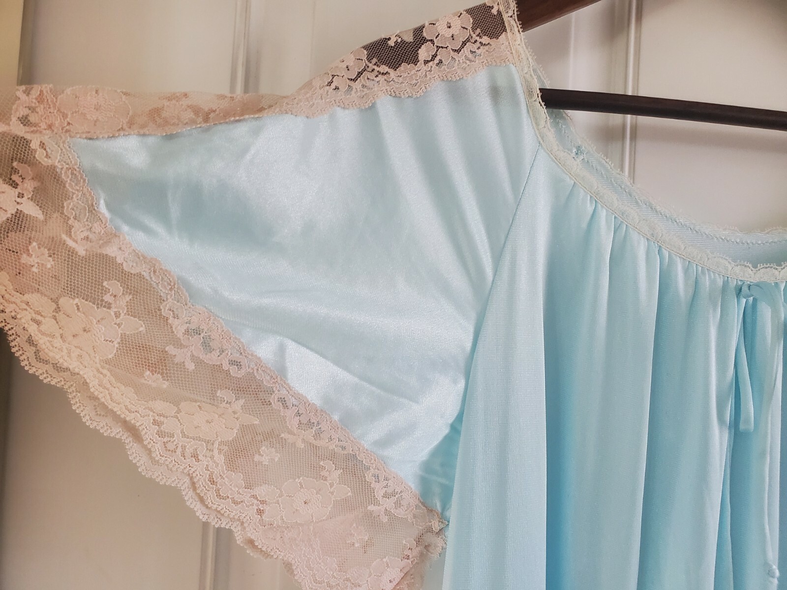 как выглядит Vintage Val Mode Silky Blue Long Nightgown Lace Trim Hollywood Womens Medium New фото