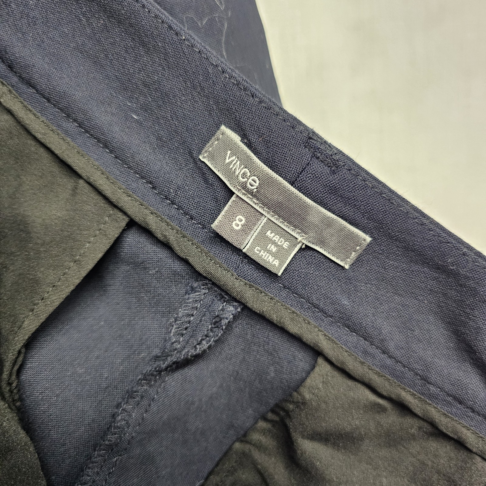 Vince Double Side Strapping Trousers Size 8 Womens Navy Blue Gray Tuxedo Stripe