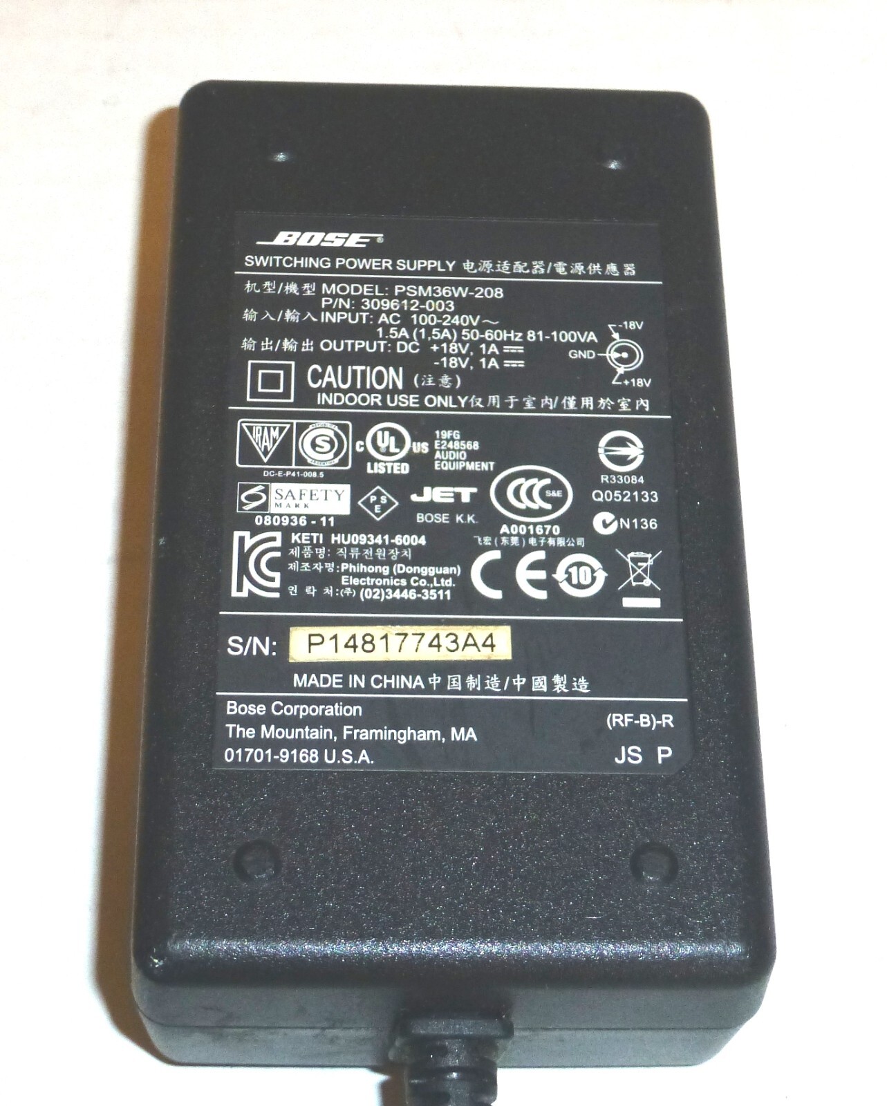Genuine Bose Switching Power Supply Model: PSM36W-208 P/N: 309612-003 18V-1A