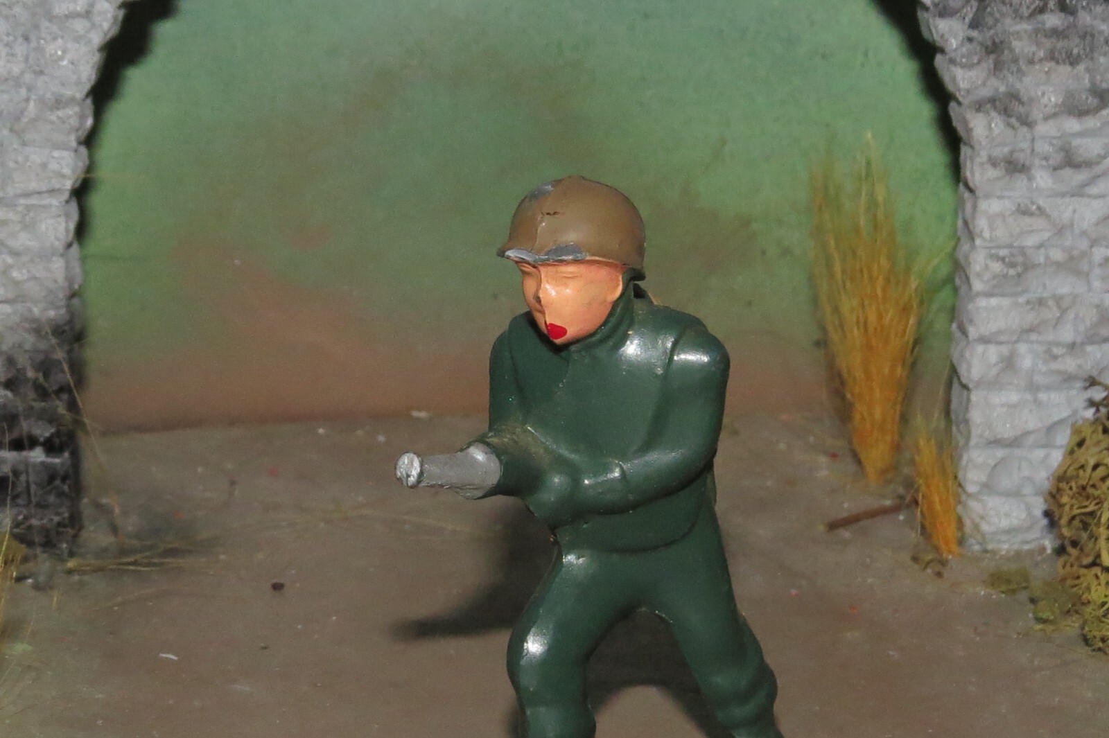 NEAR MINT BARCLAY LEAD TOY PODFOOT SOLDIER W/FLAME THROWER IN SCARCE GREEN-1950