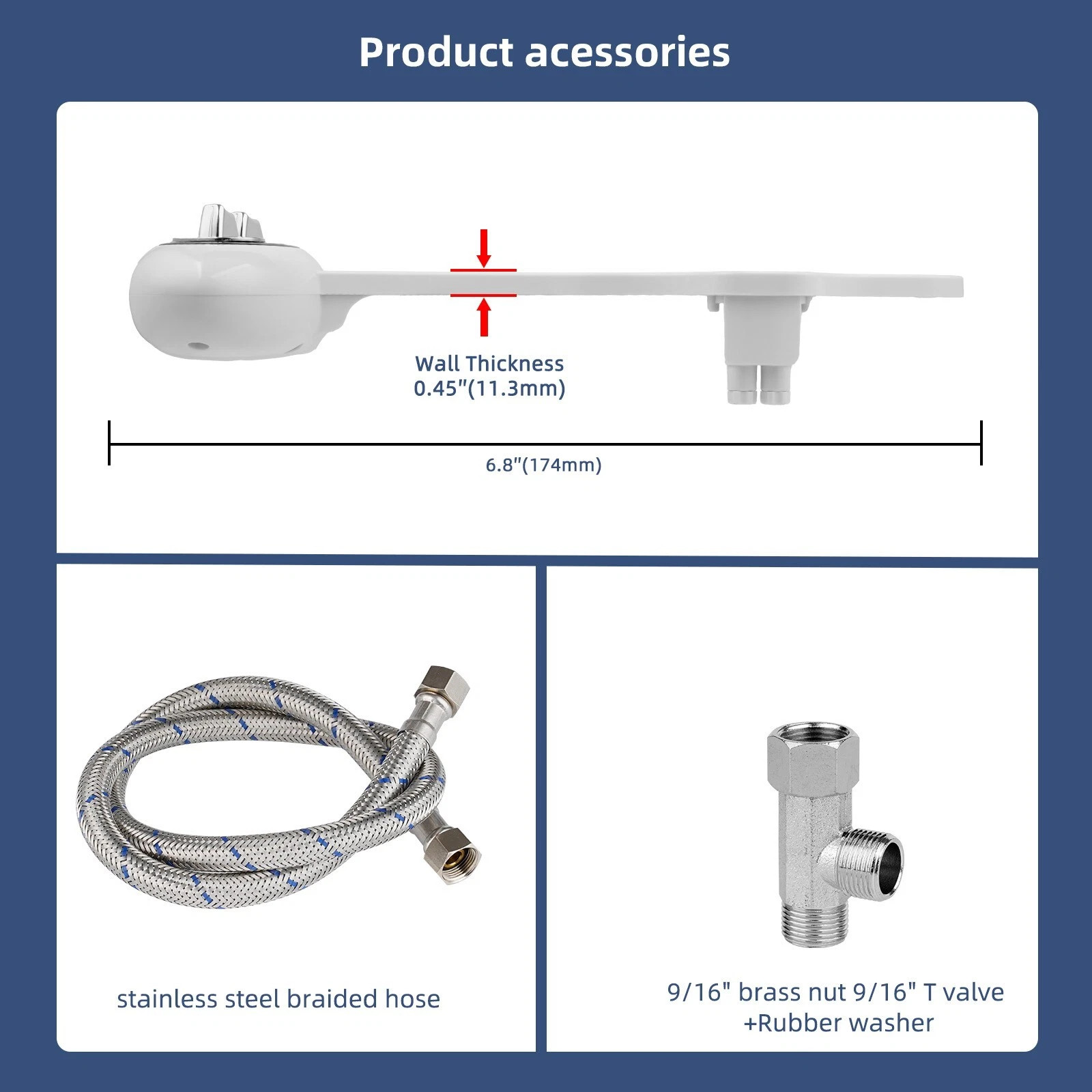 Items Included: Bidet Water Filter, Stainless Steel Braided Hose, 9/16" brass nut 9/16" T valve, Rubber washer