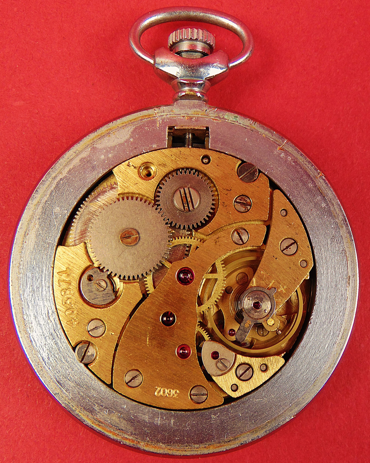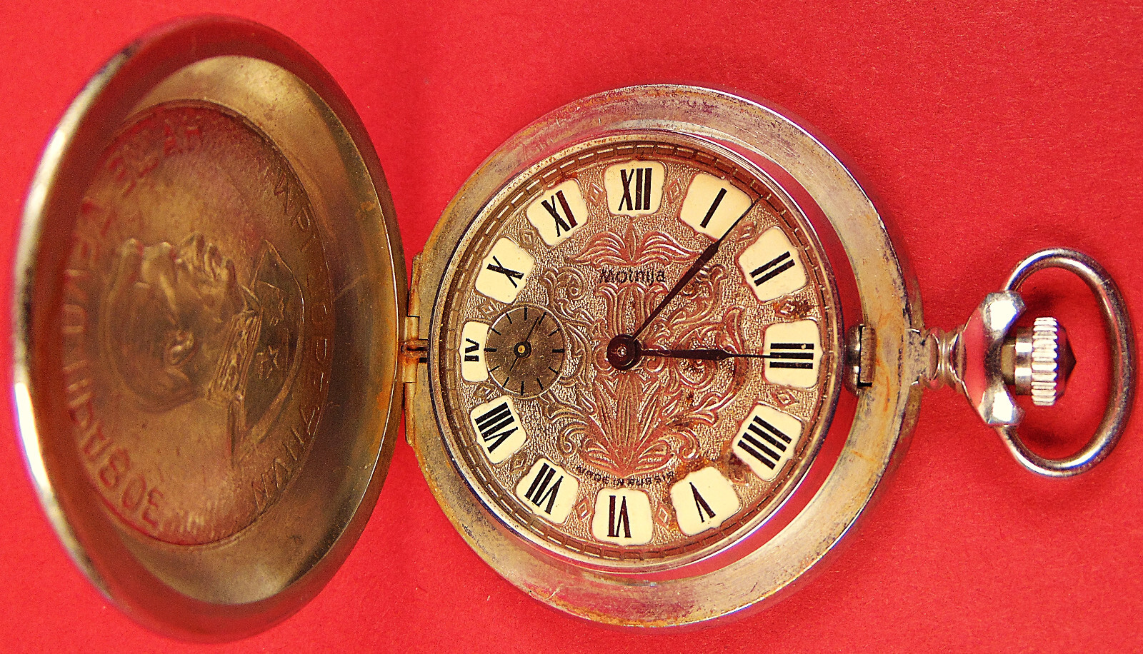 Soviet Style Russian Mechanical Molnija Pocket Watch w Portrait of Stalin on Lid