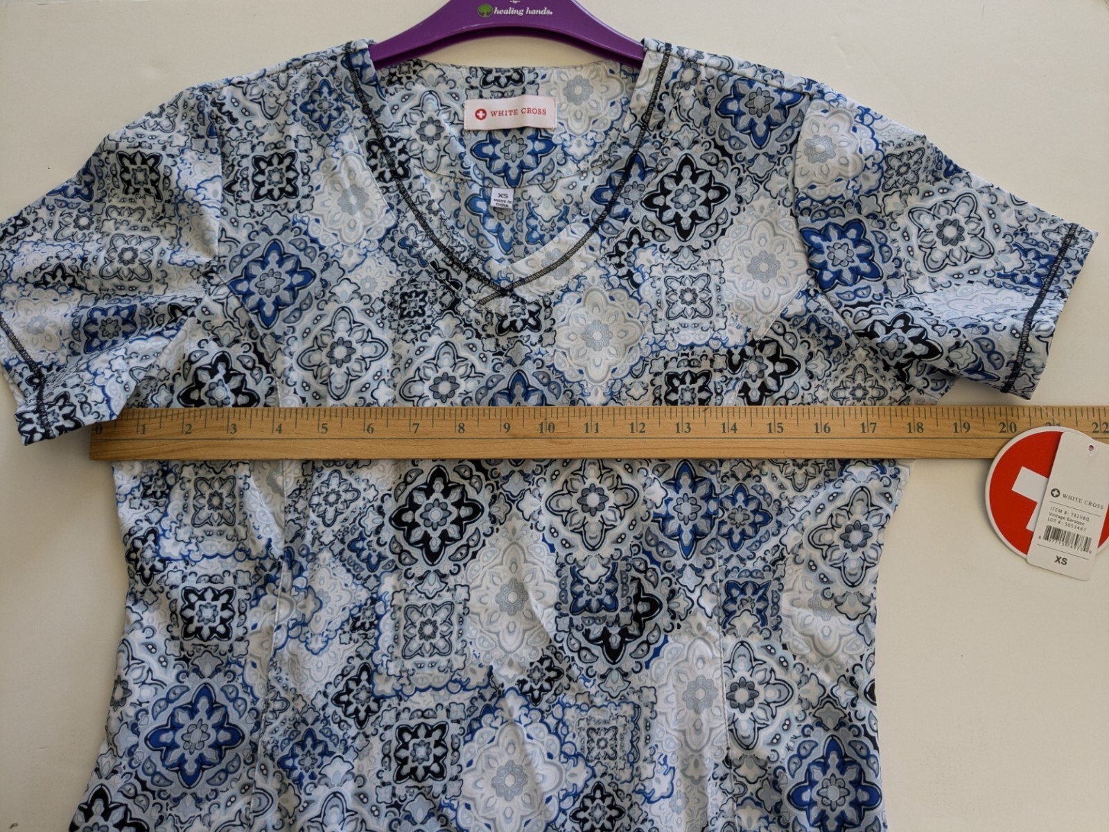 как выглядит White Cross Scrub Top 782VBQ, Sz. XS, Color Multi "Decorative Stitching" NWT фото