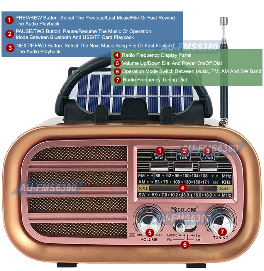 • Premium Retro FM AM Shortwave Radio Bluetooth Speaker MP3 Player Solar DC USB 5V