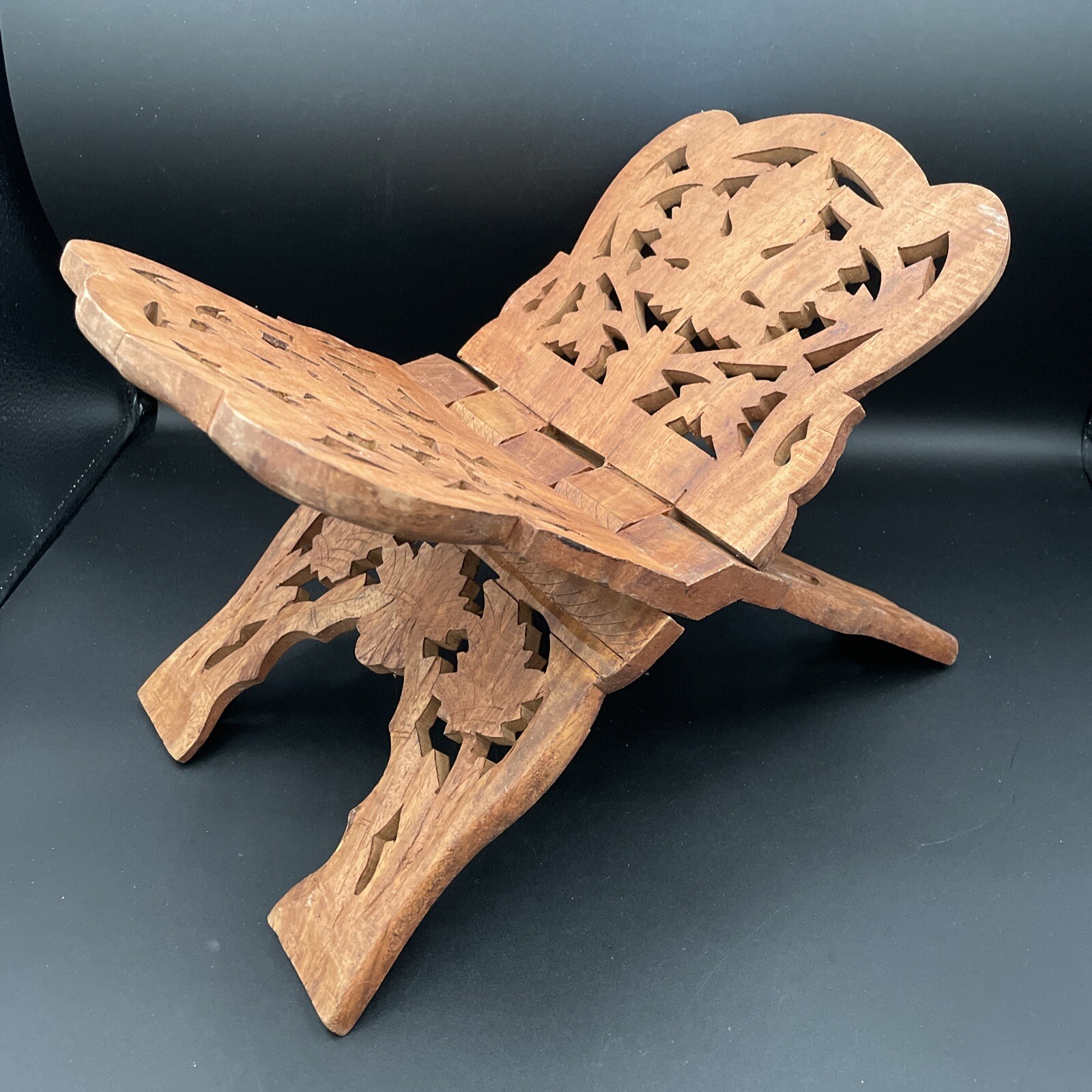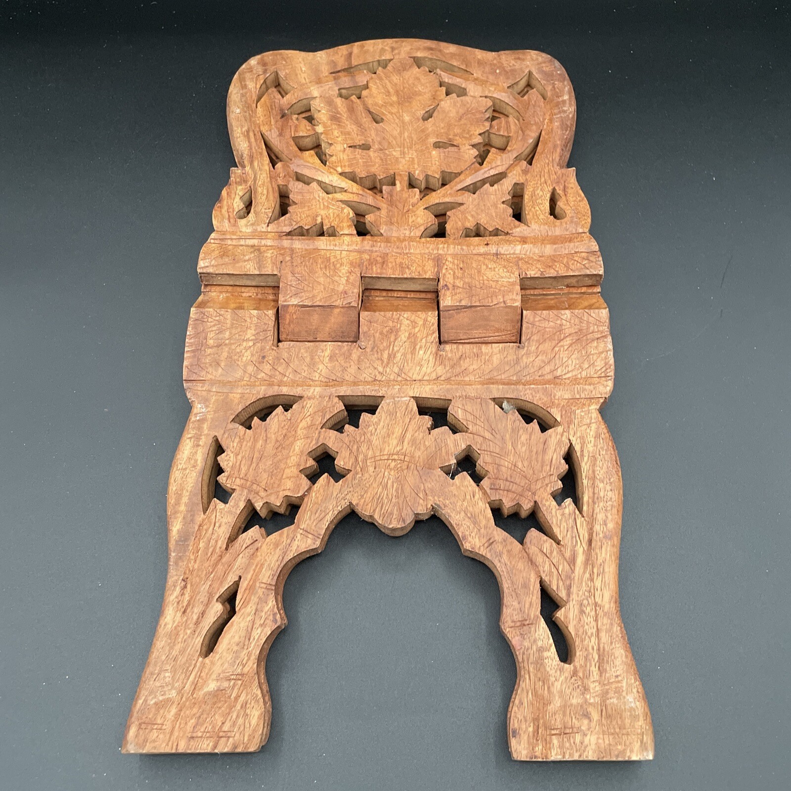 • Handcarved Open Book Display Folding Book Stand Maple Leaf Wood Bible Cookbook