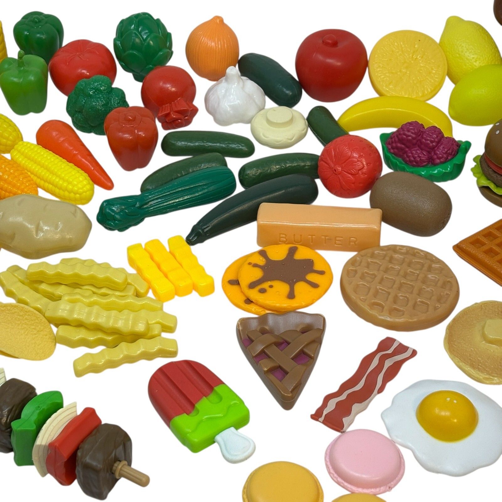 PRETEND PLAY FOOD 105 Pieces Kitchen Mixed Items Kabob Fruit Steak Bkfst Plastic