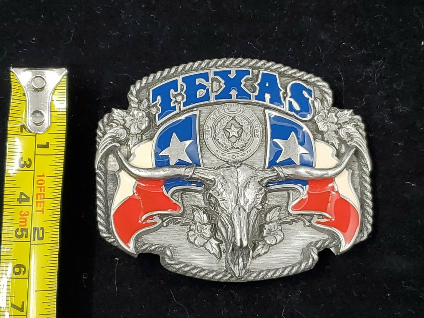 как выглядит VTG Siskiyou Texas Republic Colorful Flags Longhorn State Seal Belt Buckle 1995 фото