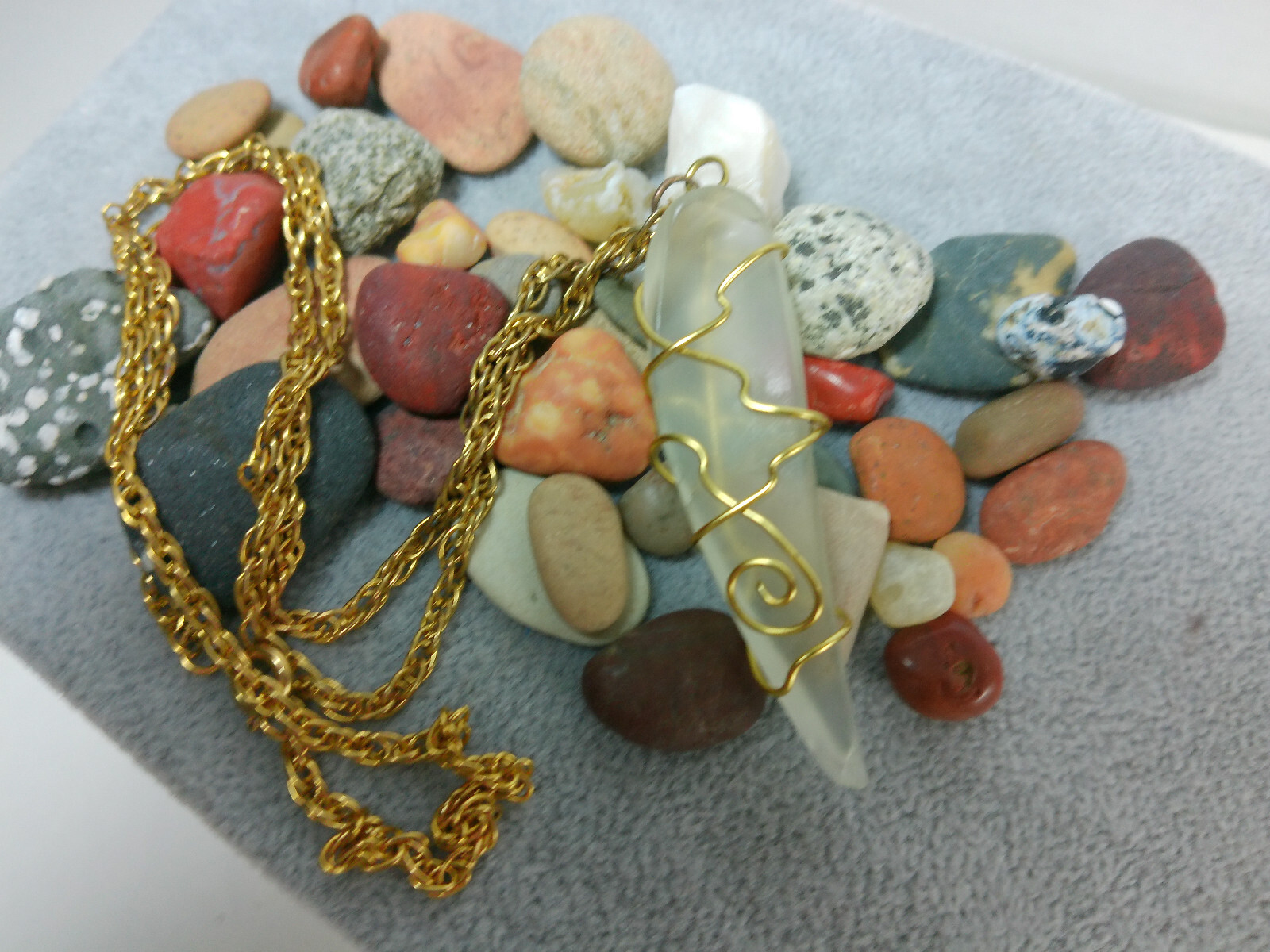 Wire Wrapped Sea Ocean Glass Gold Tone Artisan Pendant Chain Boho Beach Necklace