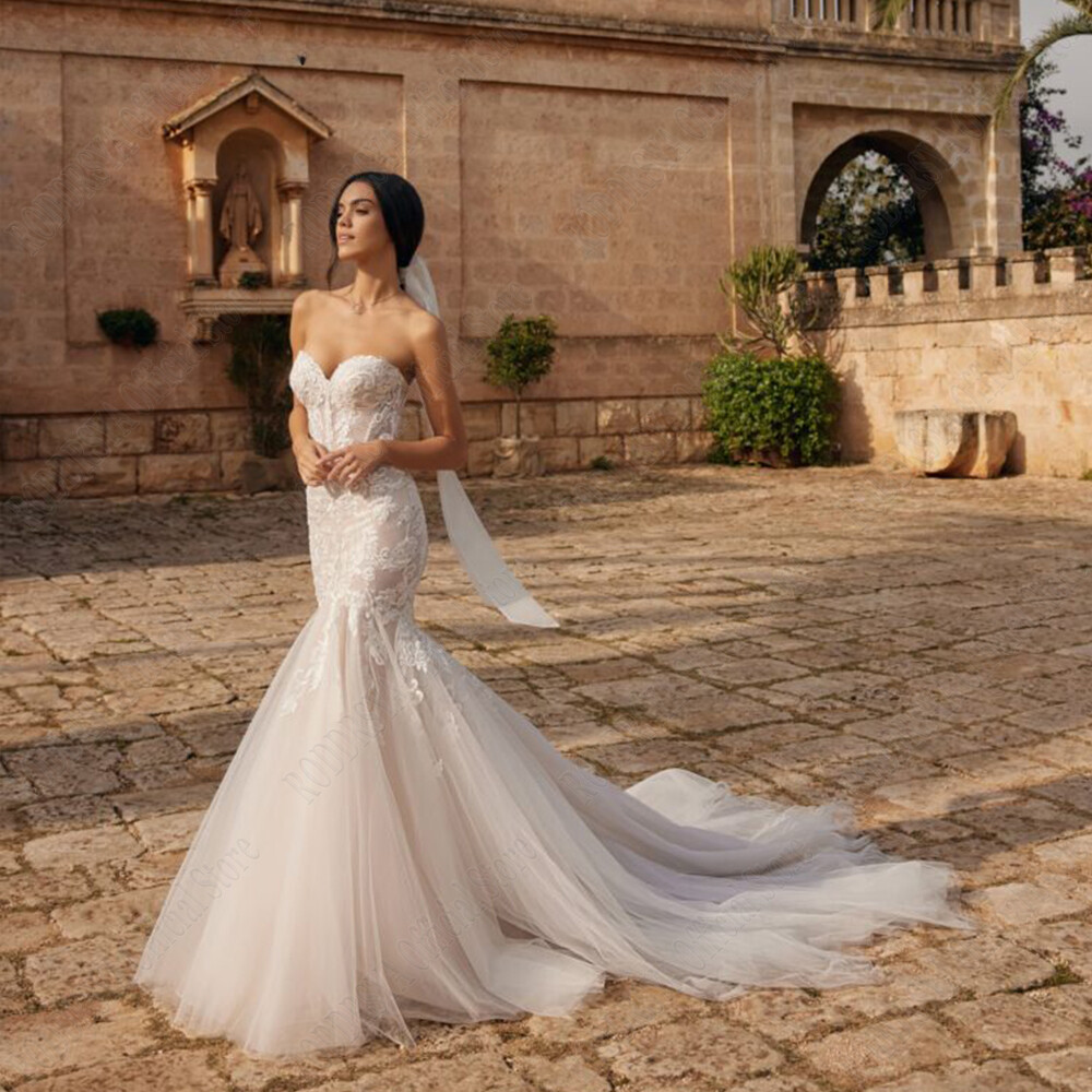 как выглядит Elegant Mermaid Wedding Dresses Sweetheart Sleeveless Lace Applique Bridal Gowns фото