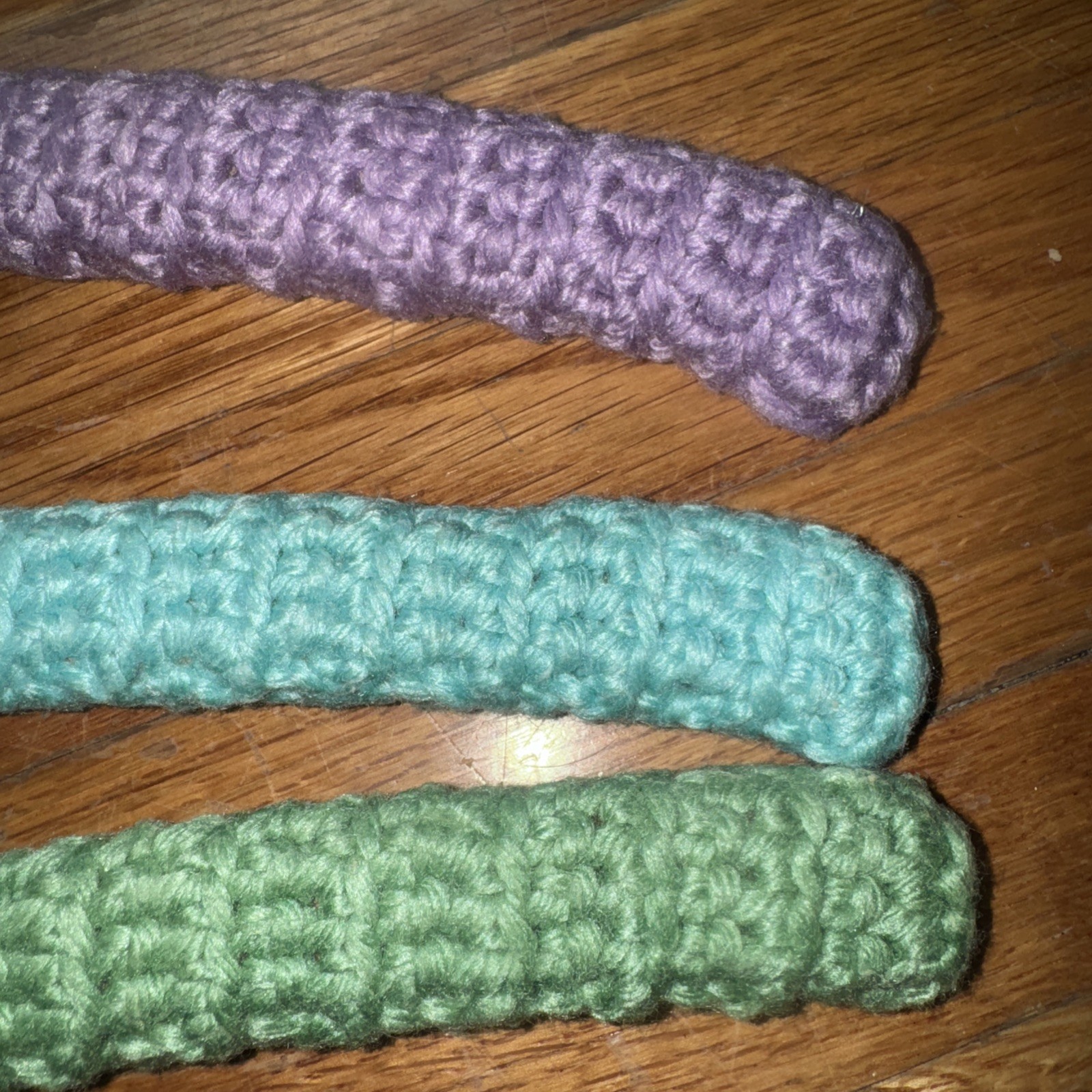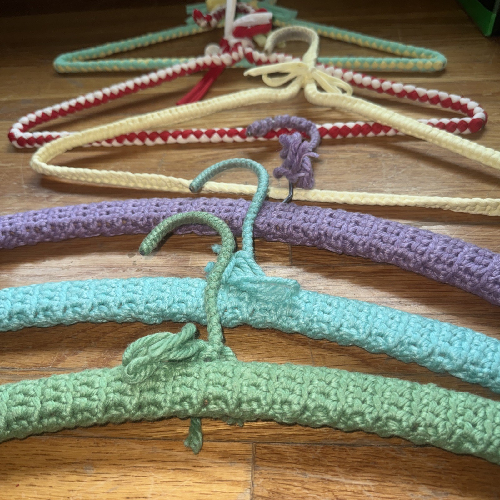 как выглядит Lot Of 6 Vintage Crocheted Metal Clothes Hangers Granny Core Cottage Pastel фото