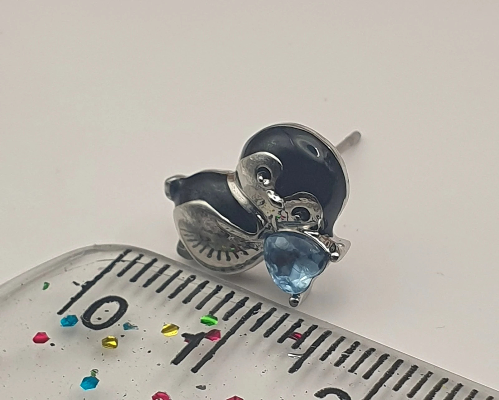 как выглядит Cute baby penguin holding blue zircon inlay heart, stud earrings, birthday gift, фото