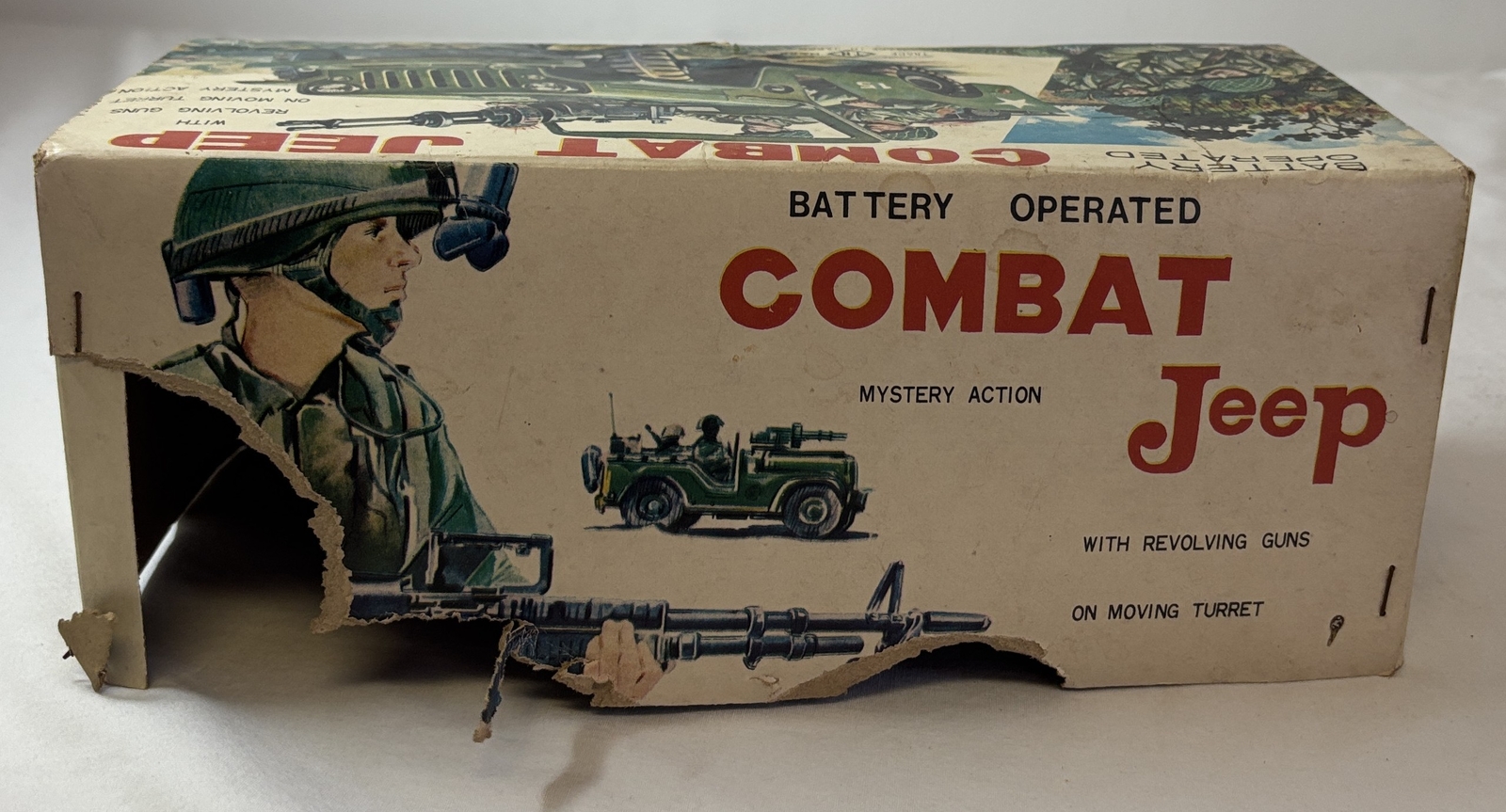 как выглядит 1960s untested tin toy battery operated COMBAT JEEP in pieces, incomplete w/box фото