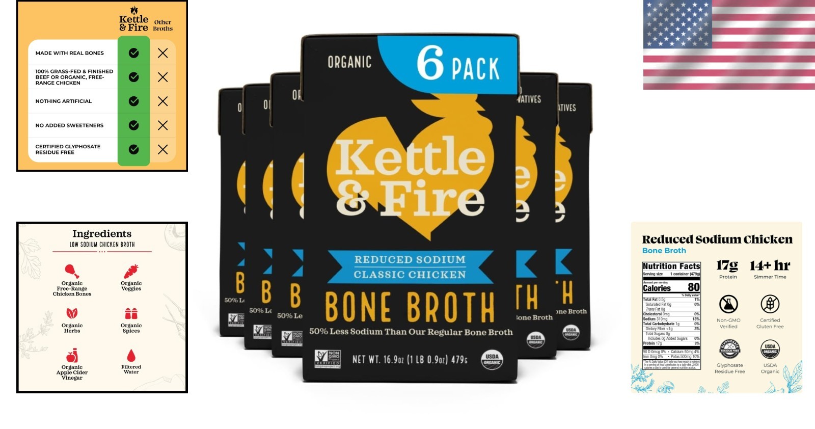 Kettle and Fire Organic Chicken Bone Broth - Natural Collagen Source, 6-Pack