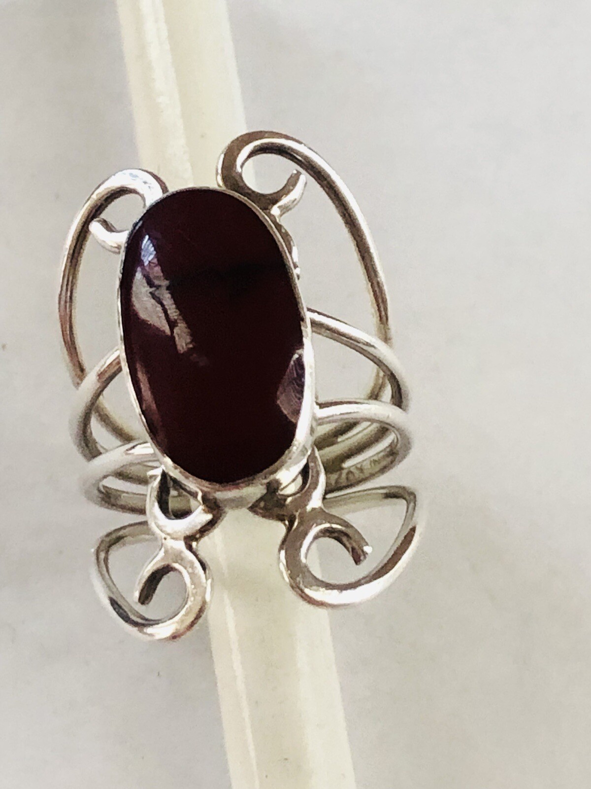 как выглядит Sterling Silver Deep Red Agate Oval Stone Long Ornate Ring Size 8 фото