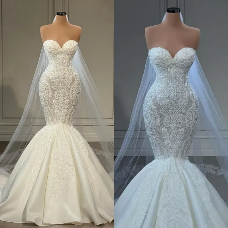 Elegant Mermaid Wedding Dresses Strapless Sleeveless Lace Applique Bridal Gowns