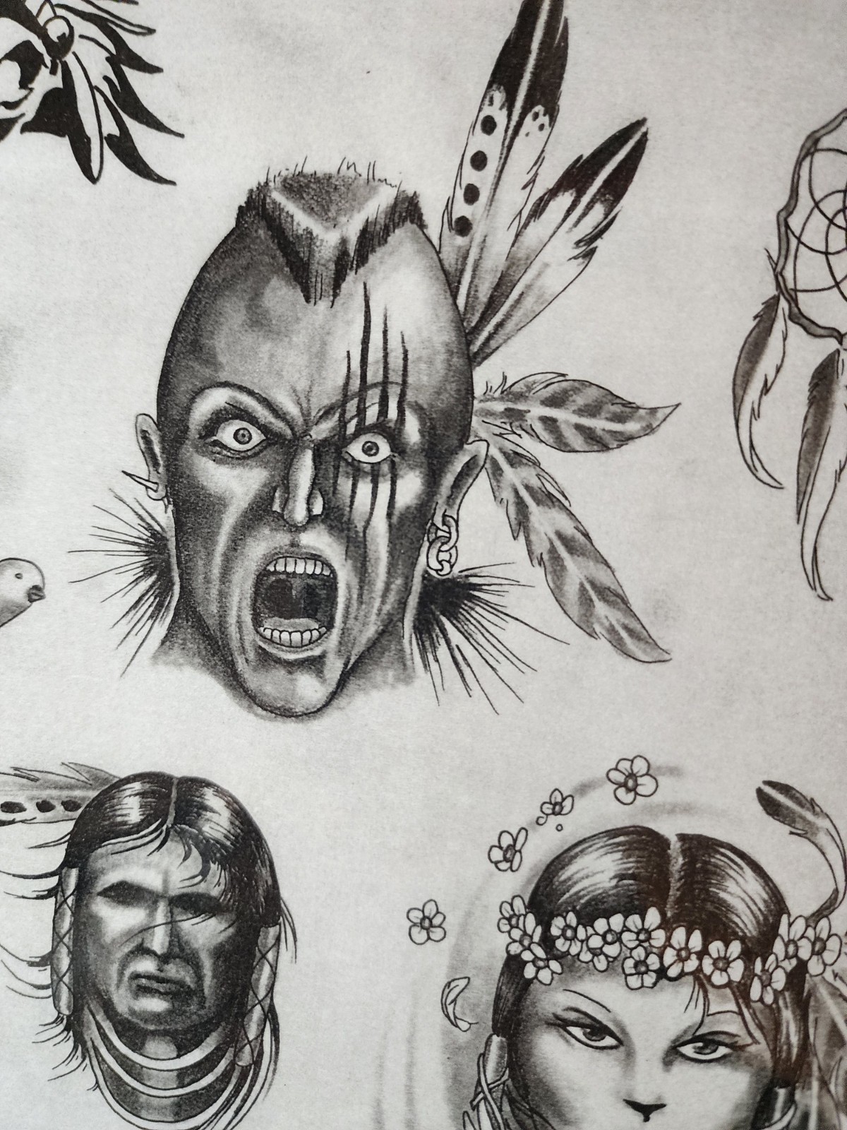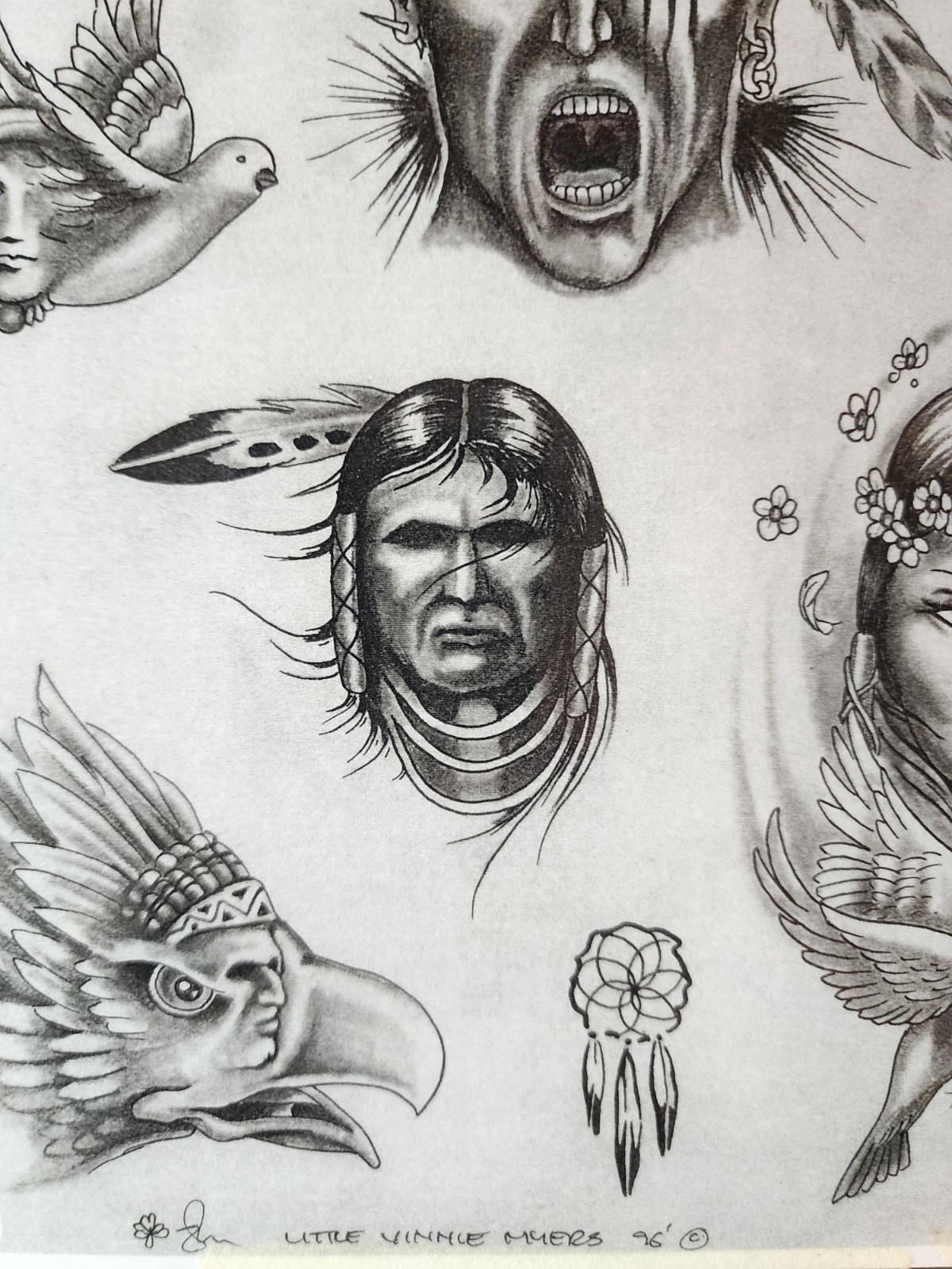 Vintage 1996 Little Vinnie Myers Traditional Tattoo Flash Sheet Shop Used Native