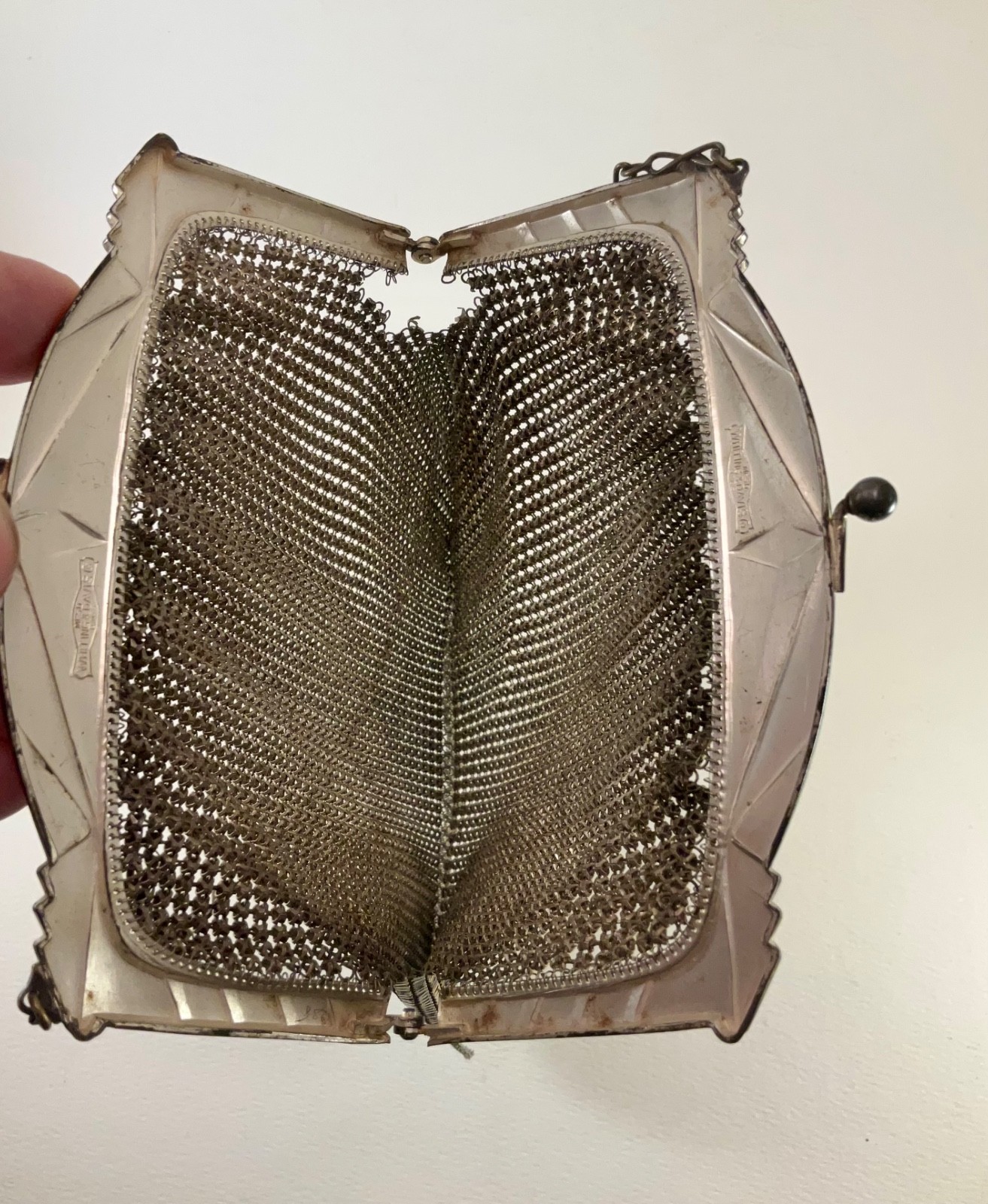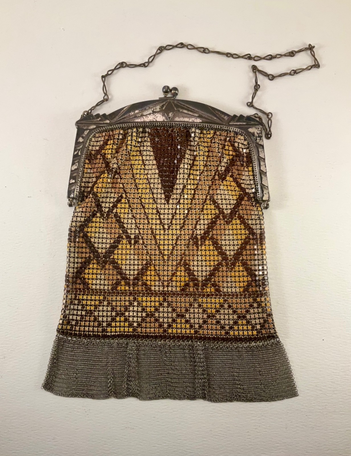 Antique WHITING DAVIS Flapper Art Deco Fringe MESH PURSE Enamel Gold/Silver 589