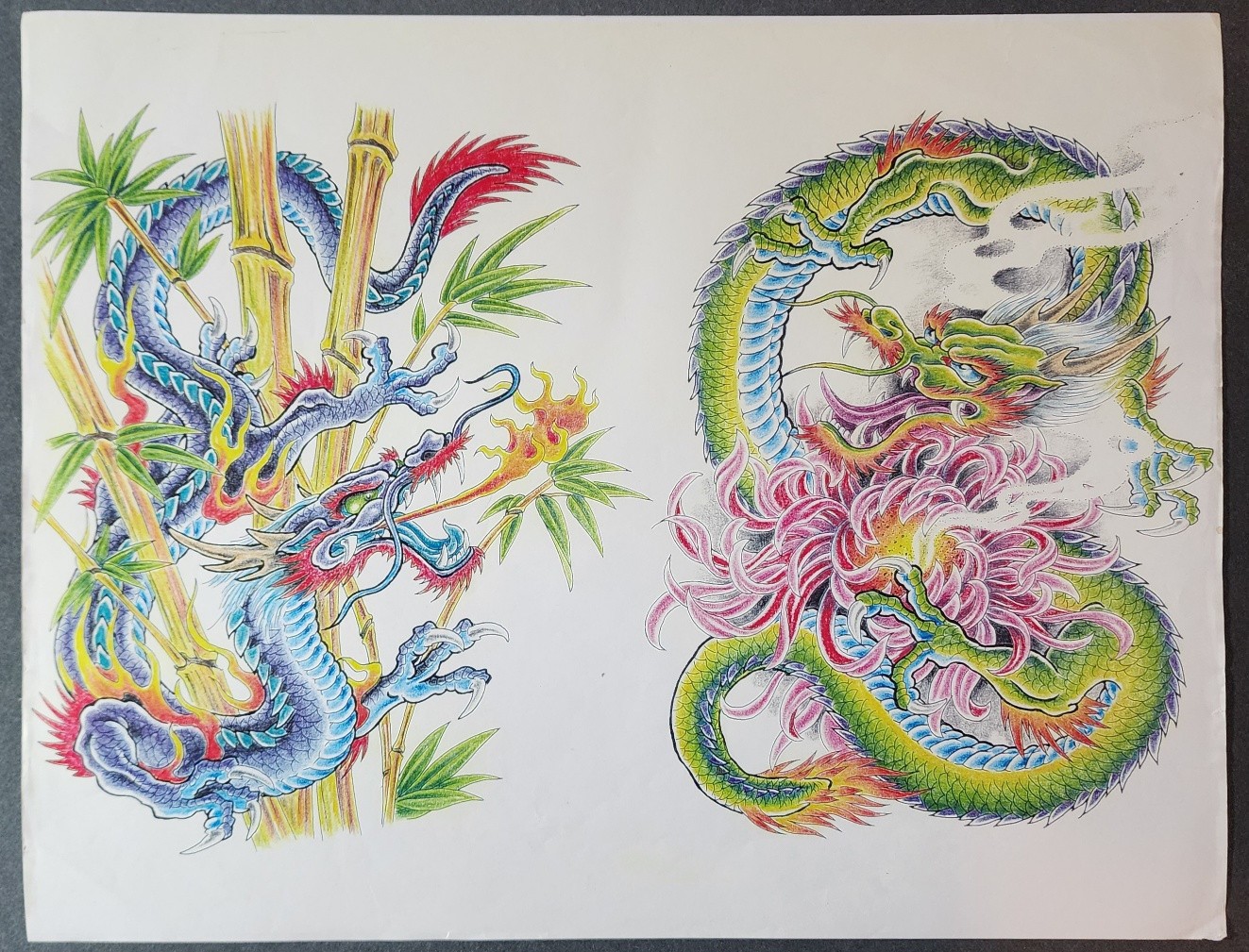Vintage Paul Jeffries Japanese Traditional Tattoo Flash Sheet With Lines Dragons