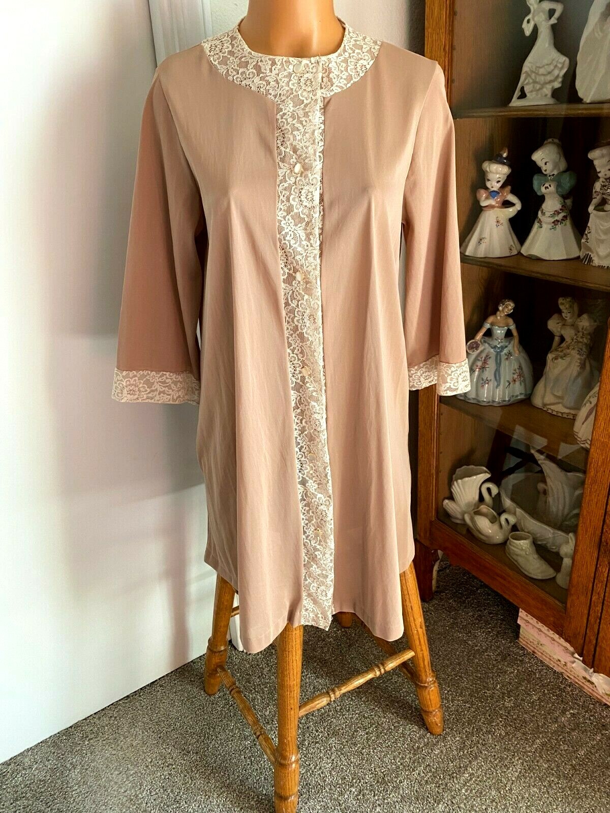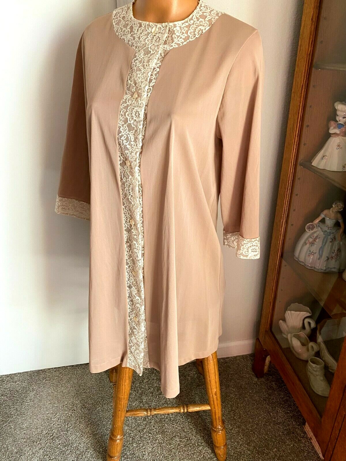 как выглядит VTG 60s MCM FORMFIT ROGERS COCOA BEIGE W/ IVORY LACE NYLON ROBE NIGHTGOWN SZ M фото