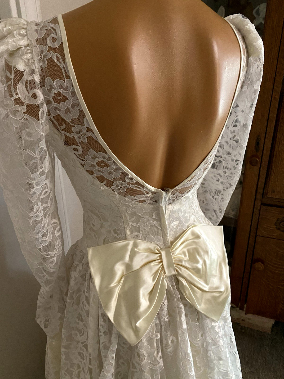 как выглядит VINTAGE 70s 80s ALFRED ANGELO WHITE LACE - LOW BACK WEDDING DRESS SZ 3/4 фото