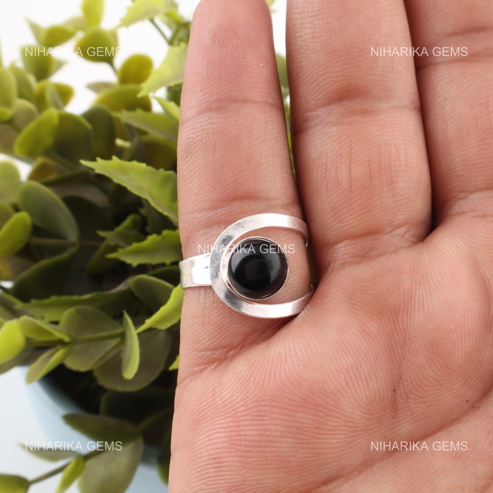 как выглядит Round Natural Black Tourmaline Handcrafted Band Engagement Ring Sterling Silver фото