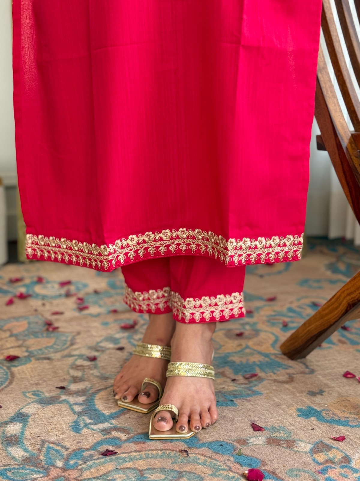 Petrol Blue, Rani Pink, Wine Purple Kurti Pant Dupatta Embroidered Set