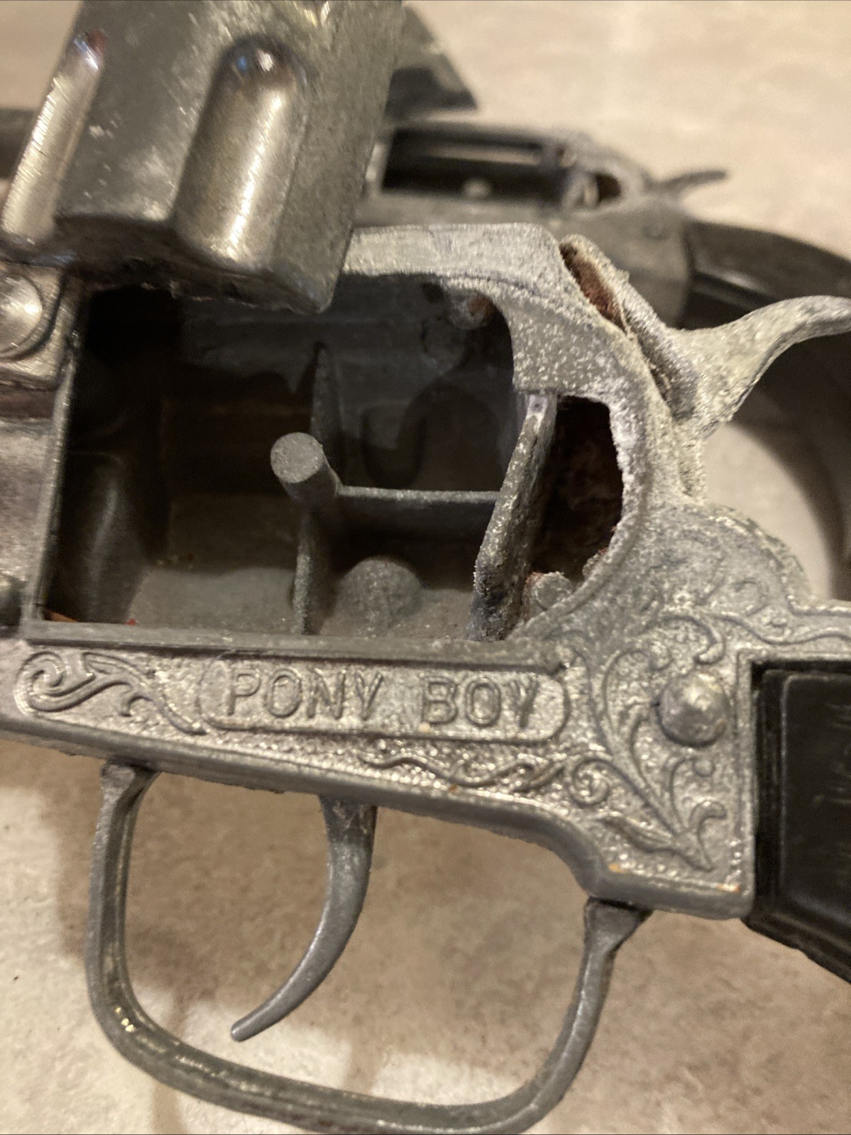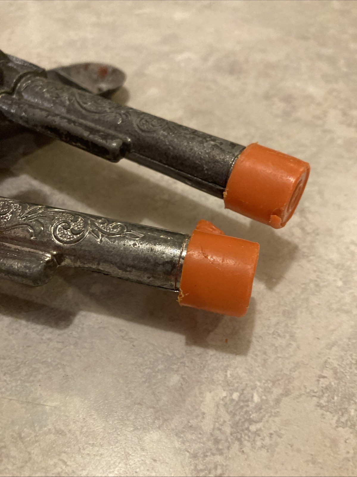 как выглядит Vintage Pony Boy Cap Guns Two Guns Rough Shape Orange Safety Tabs On Guns фото