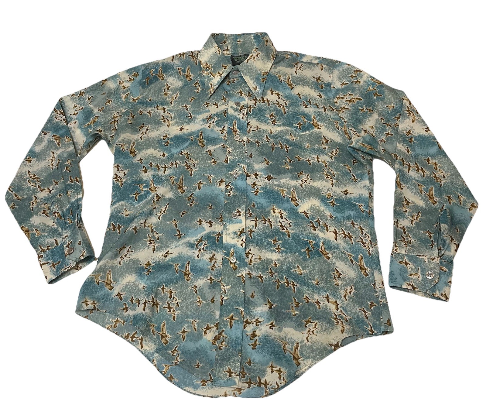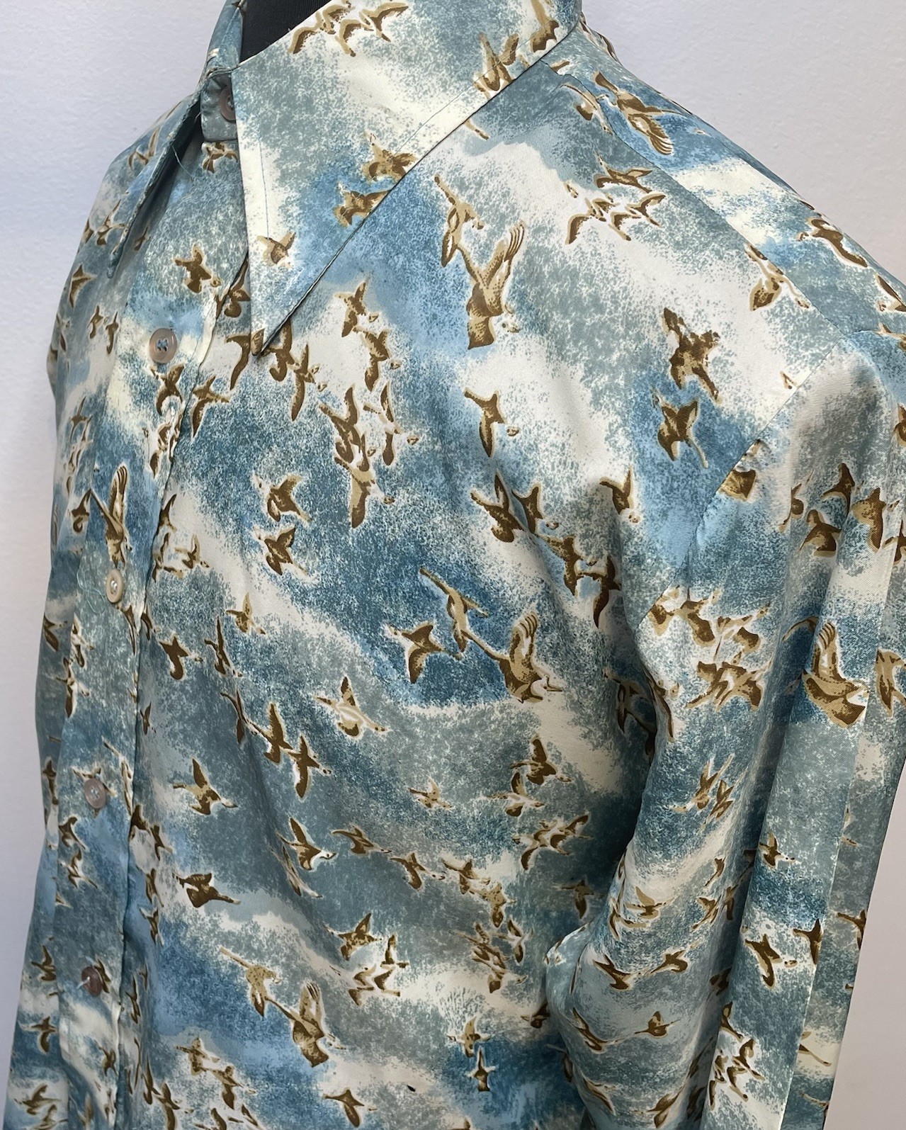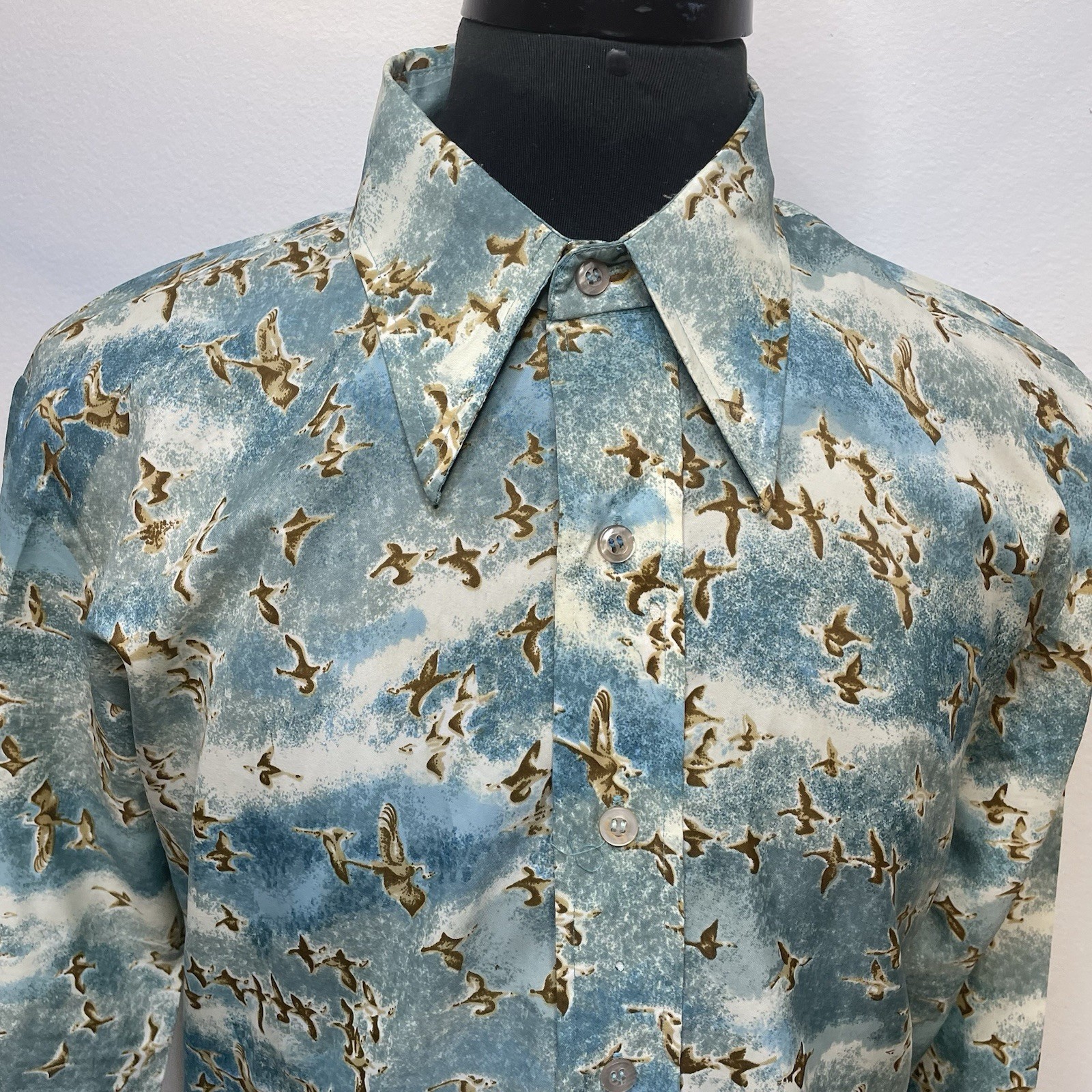Mens 16.5 / 34 Vintage Woven Shirt Poly 70 s Disco Retro Birds All Over Casual