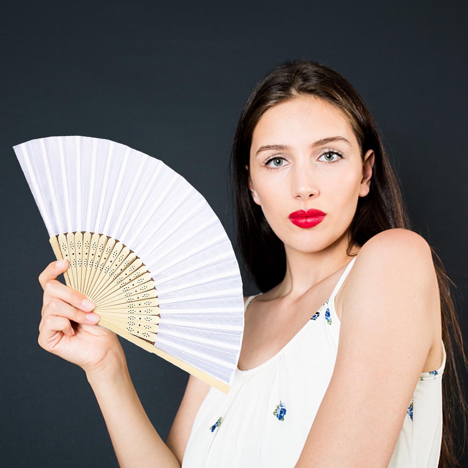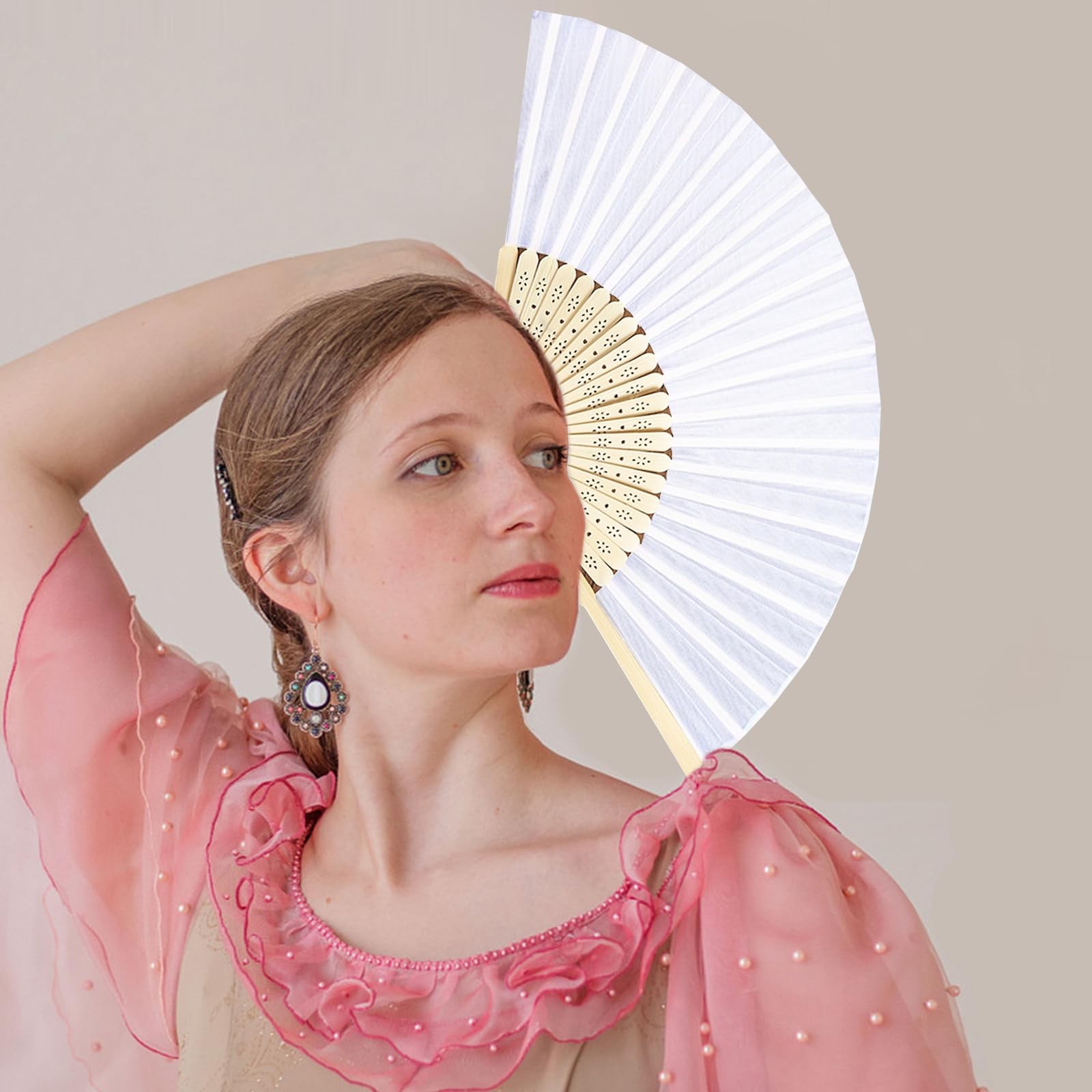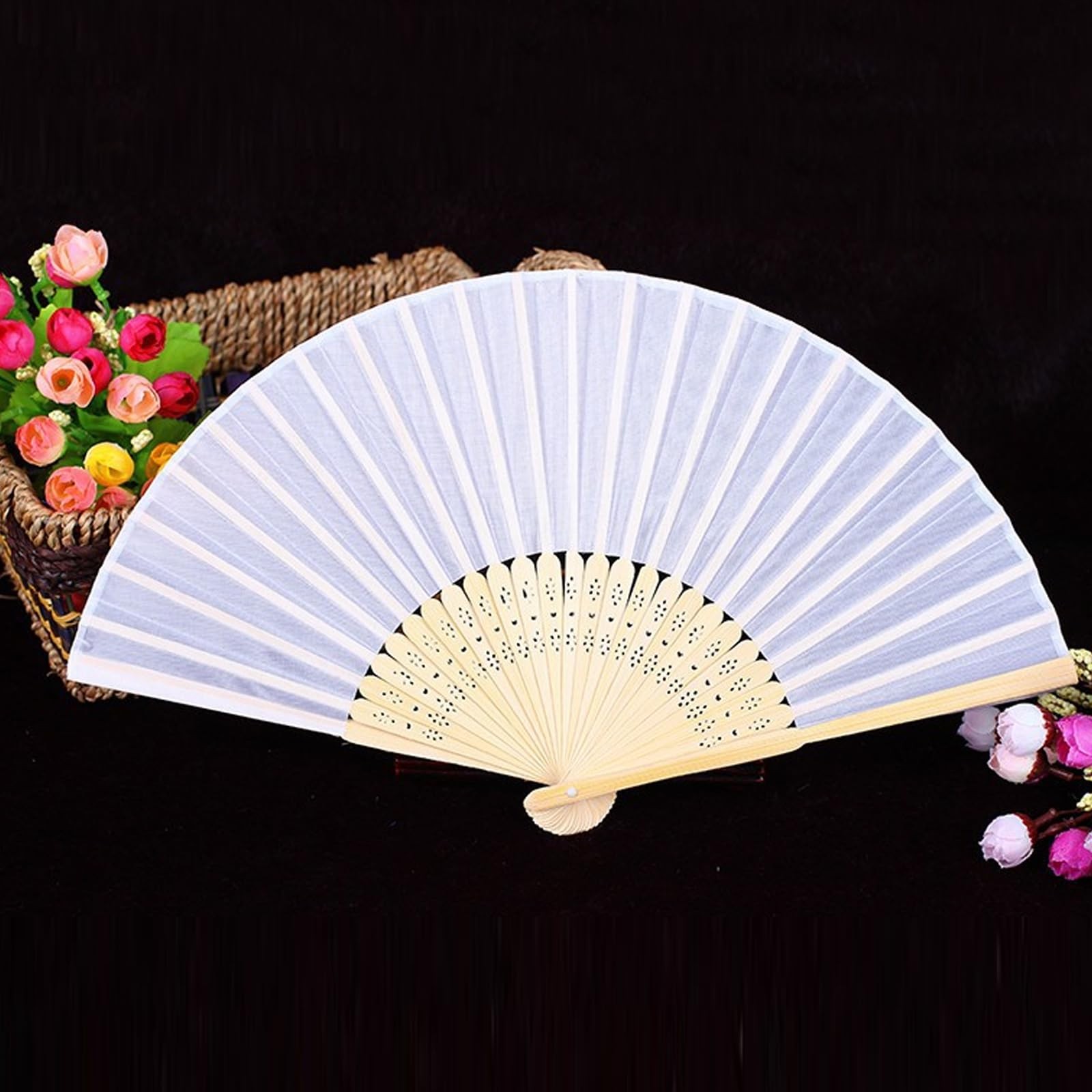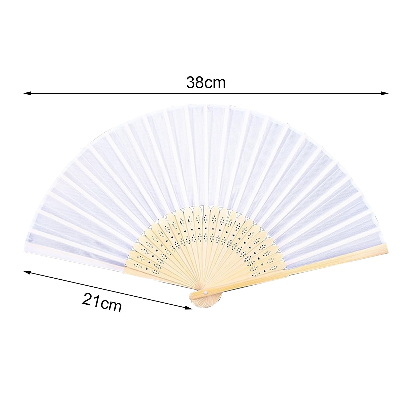 White Fabric Silk Handheld Folding Hand Fan Bamboo Ribs Chinese Japanese Style